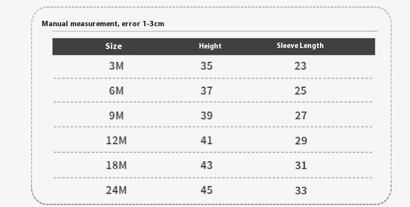 Suitable height: 3M/suitable for about 52cm, 6m/suitable for about 59cm, 9M/suitable for about 66cm, 12M/suitable for about 73cm, 18m/suitable for about 80cm, 24m/suitable for height about 85cm