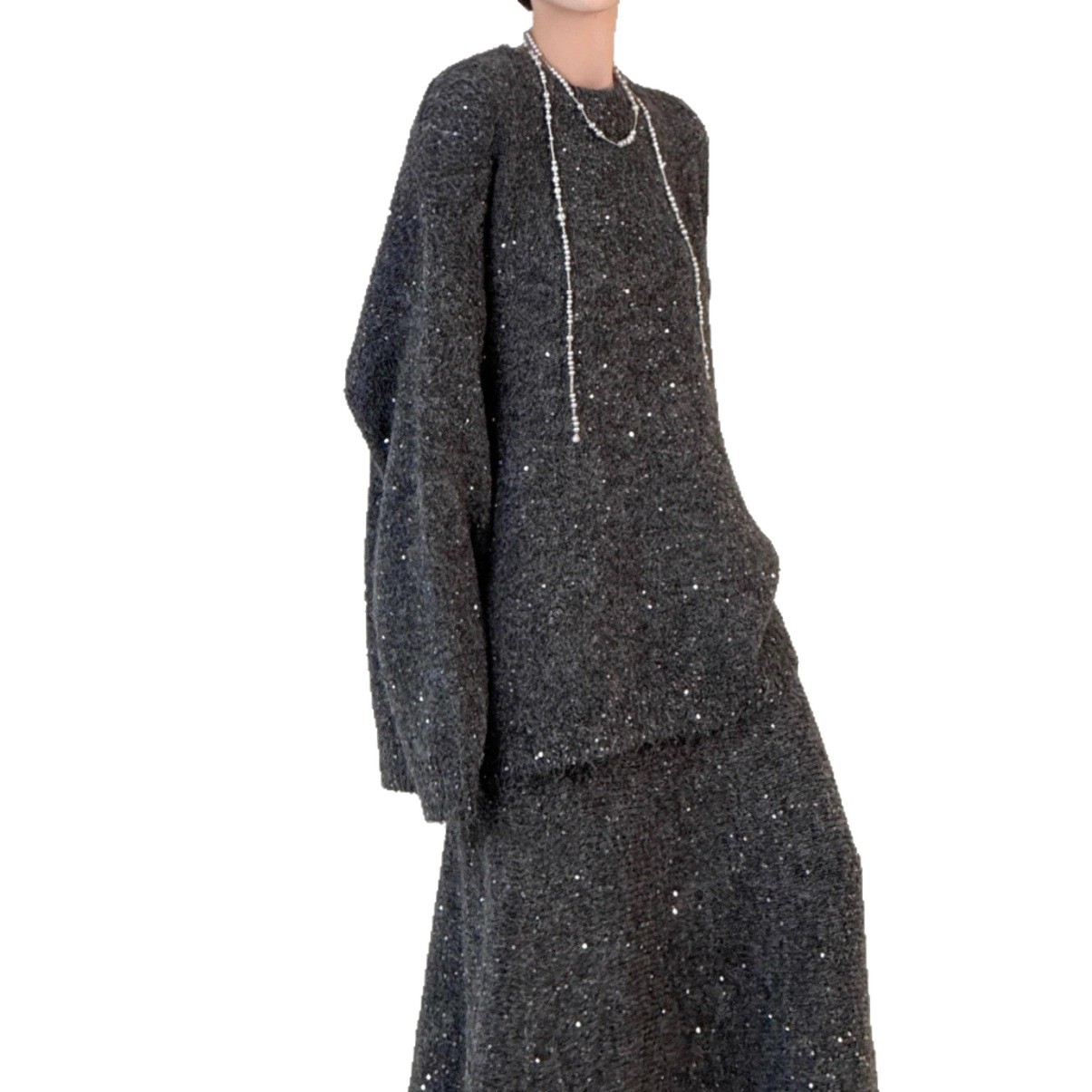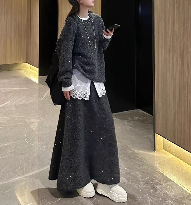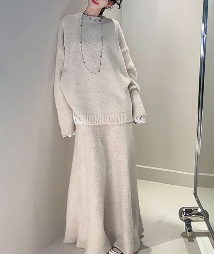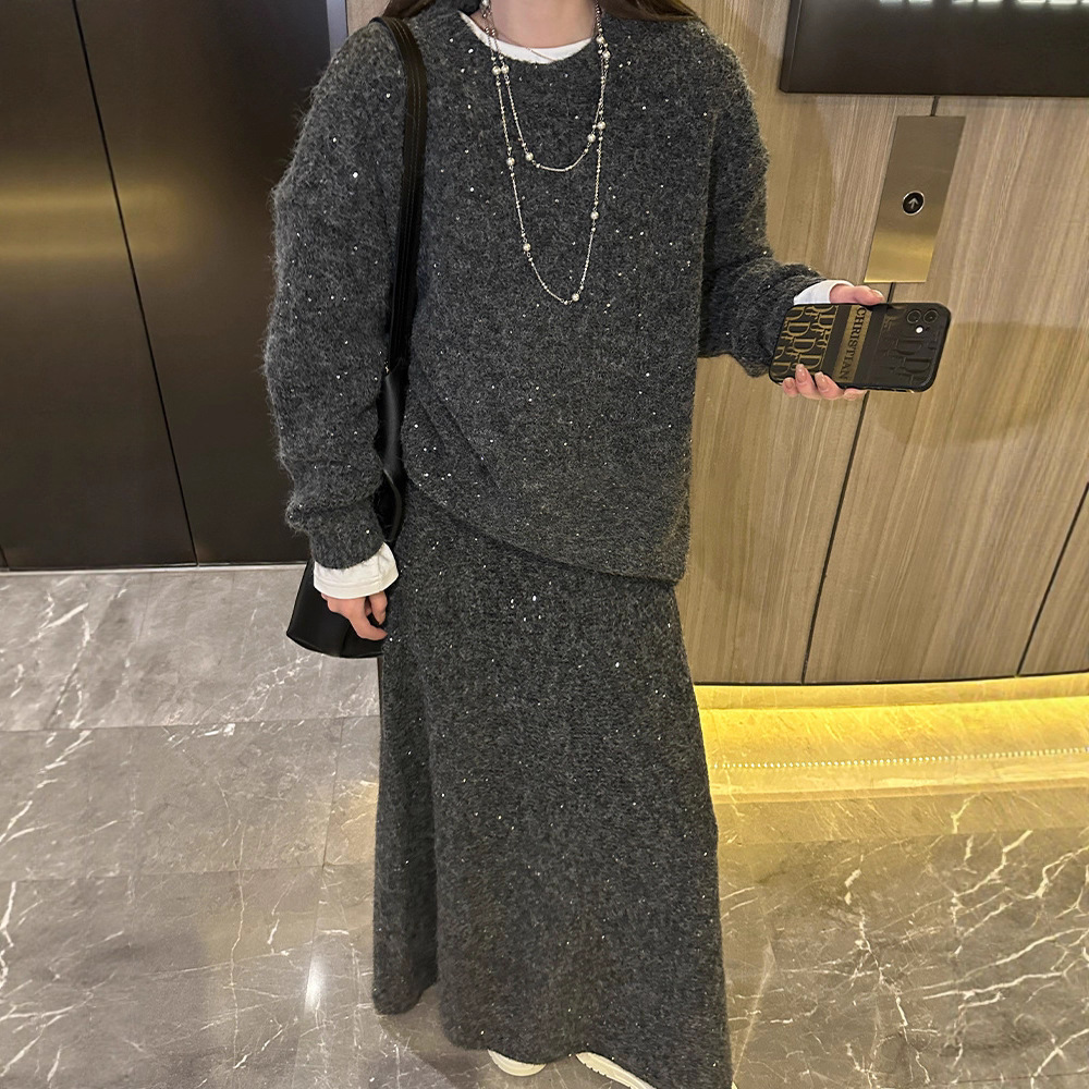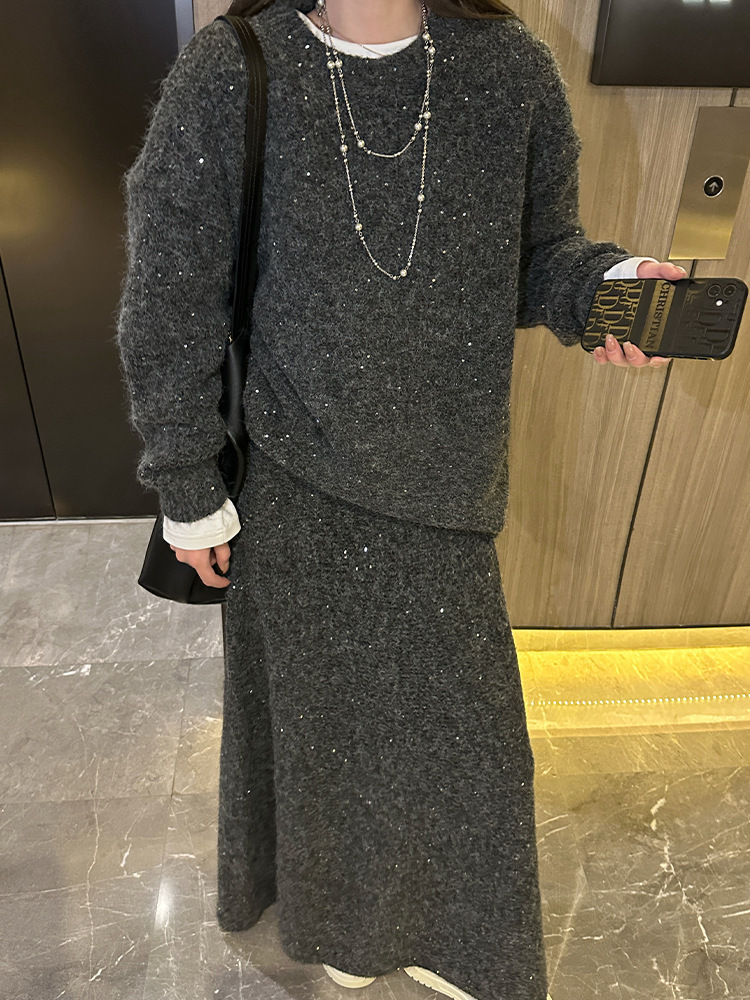 Loose Sequin Sweater Women Elastic Waist Fishtail Skirt Set