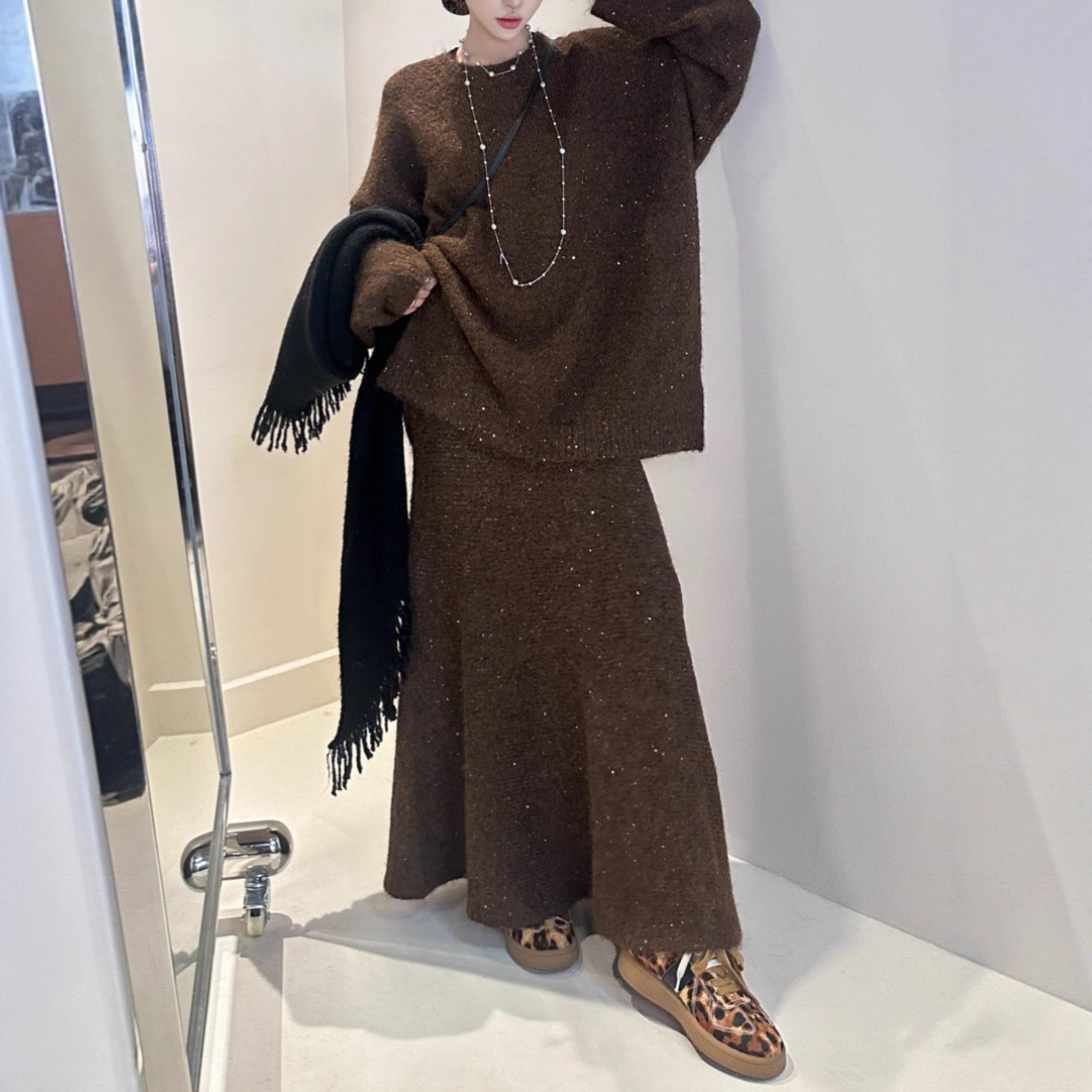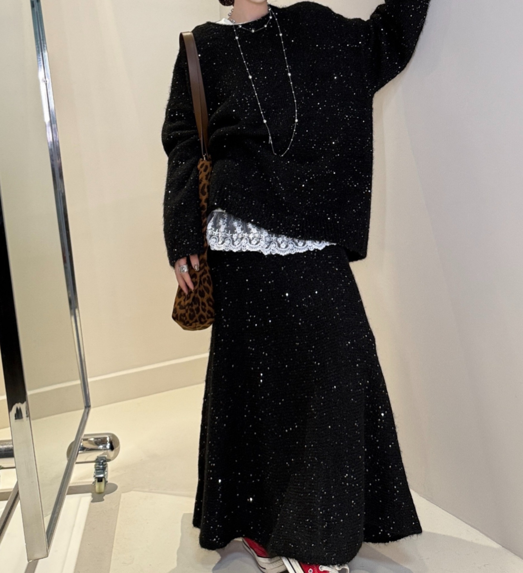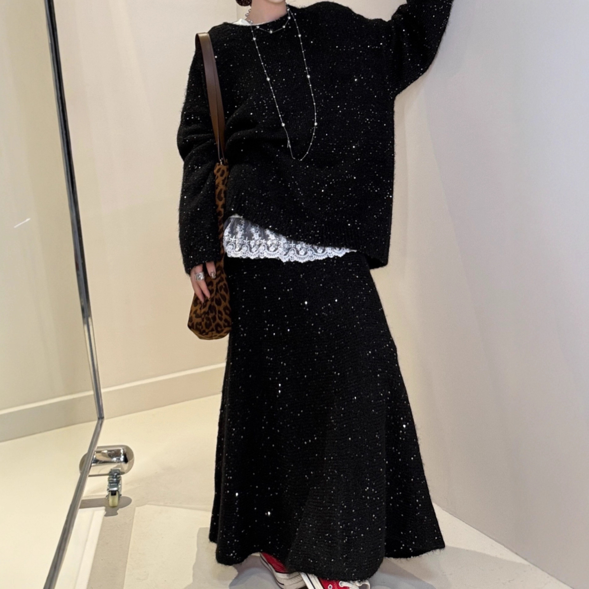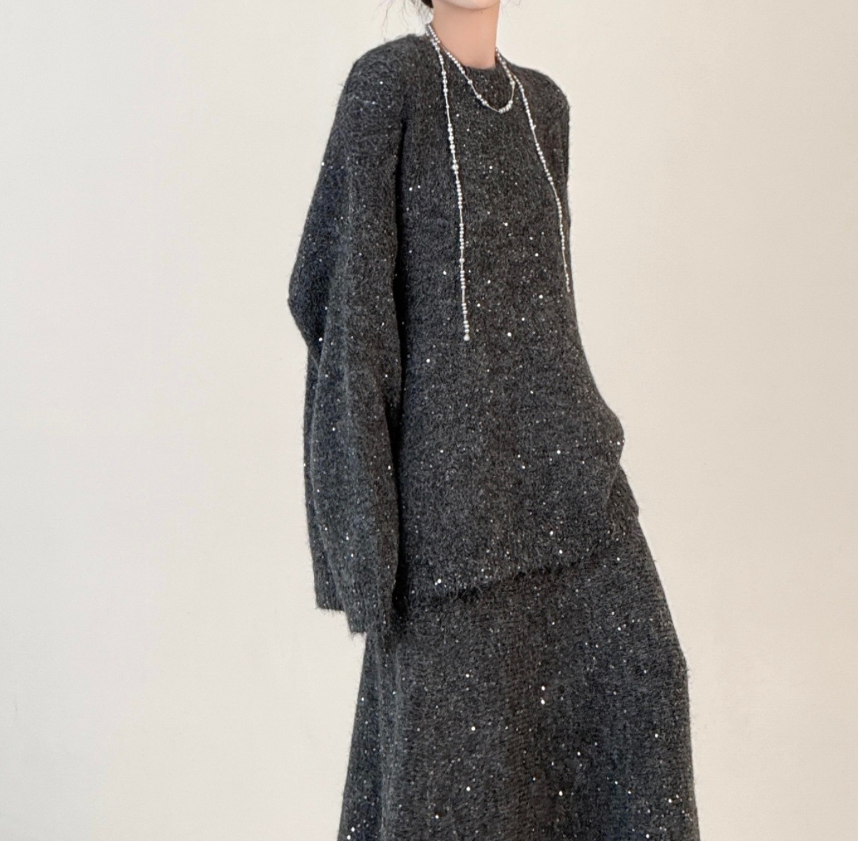 Loose Sequin Sweater Women Elastic Waist Fishtail Skirt Set