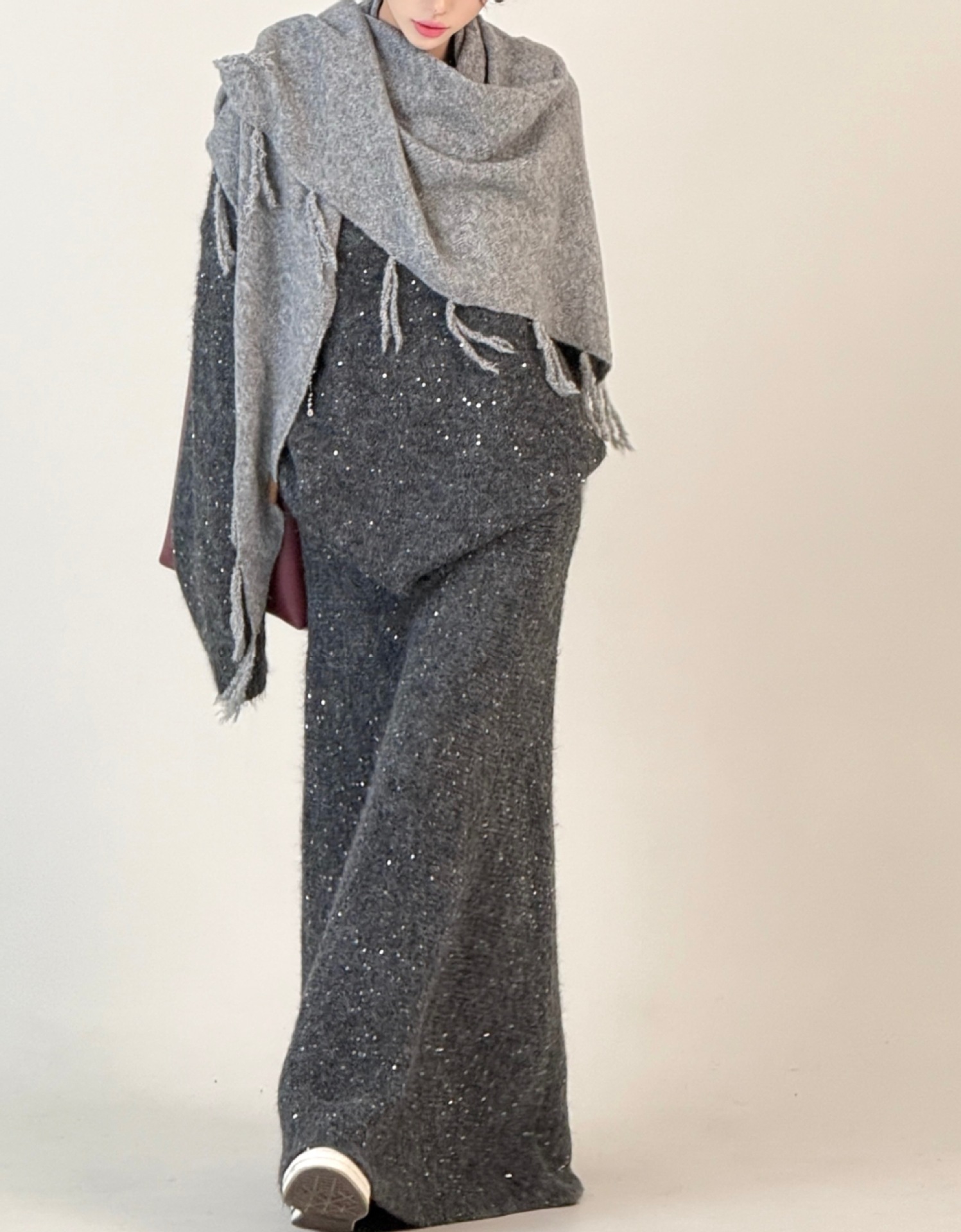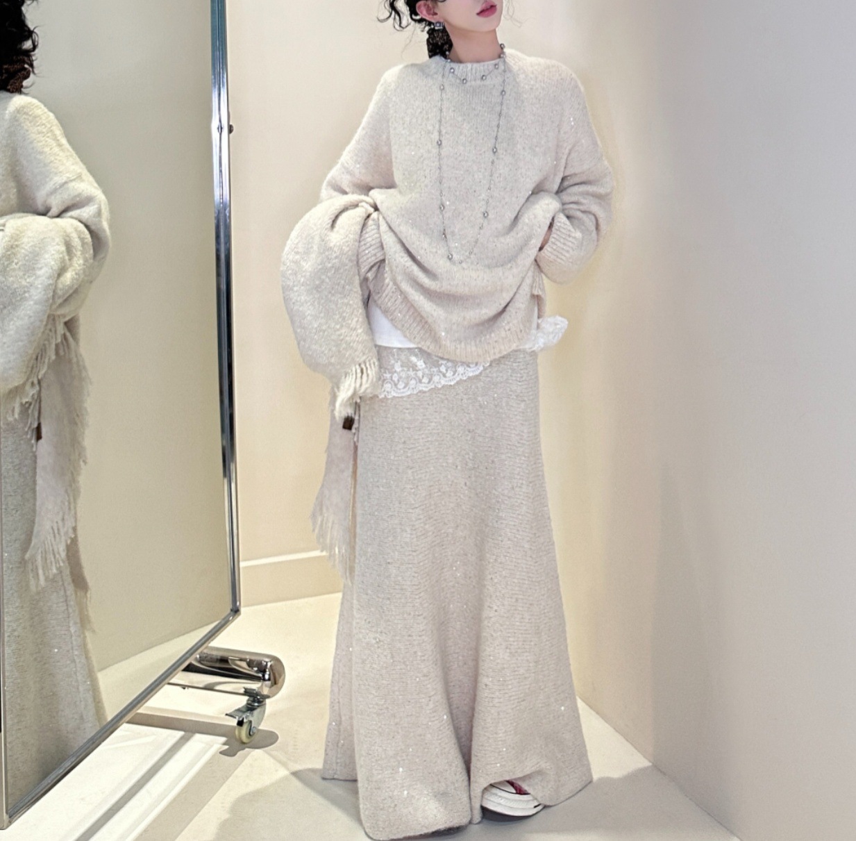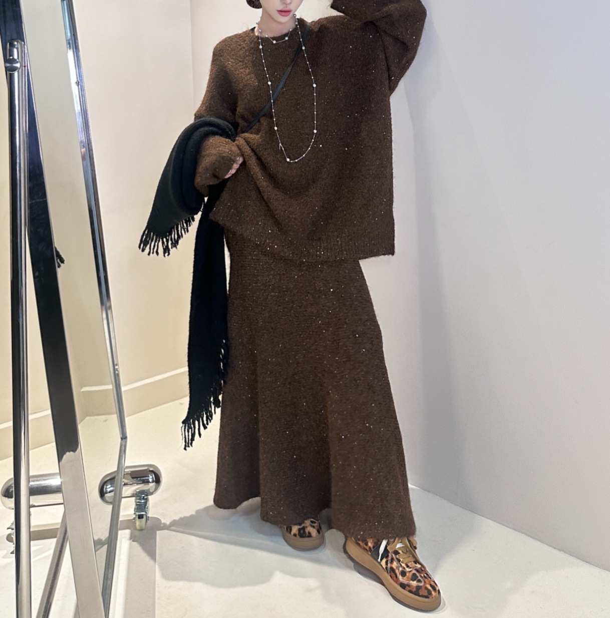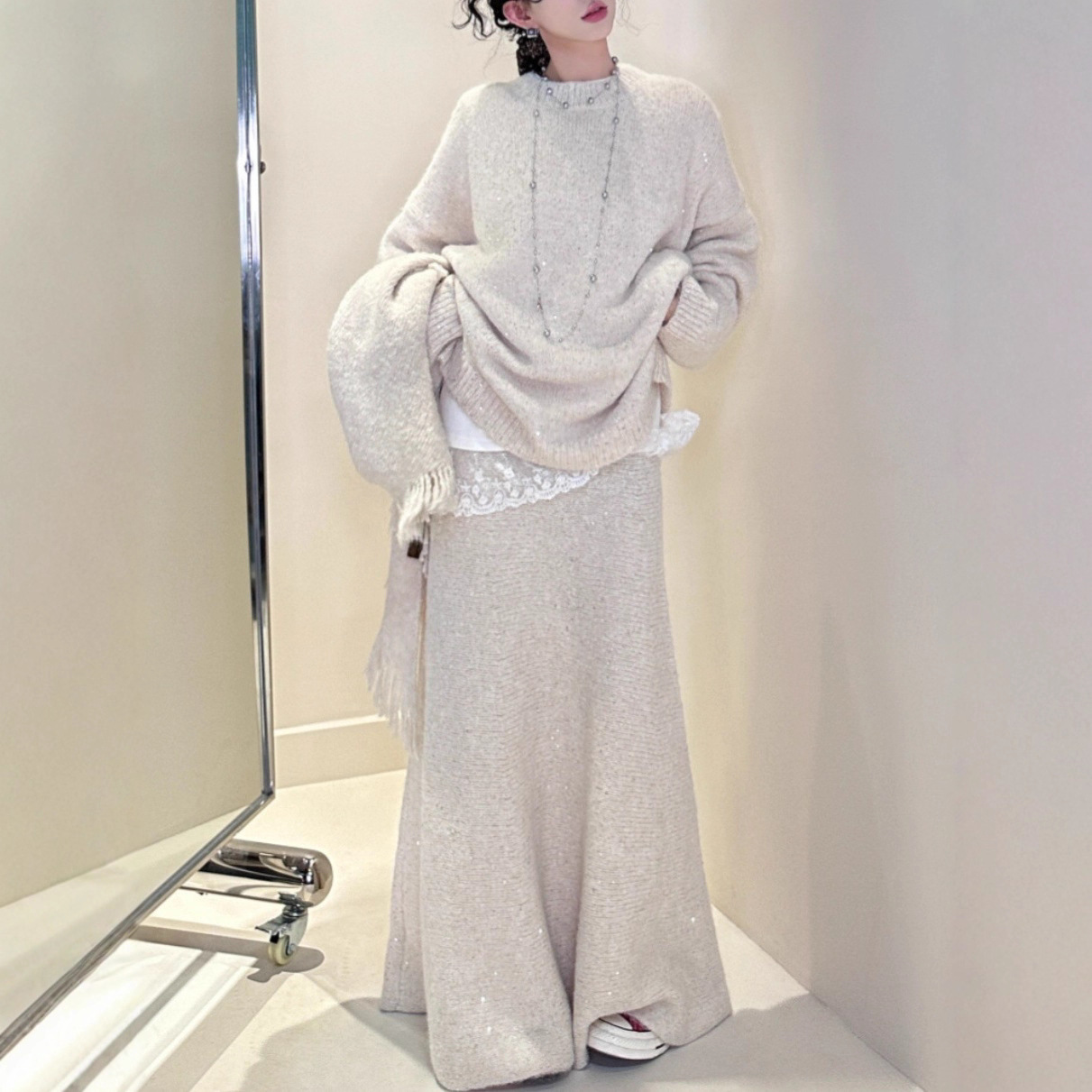 Loose Sequin Sweater Women Elastic Waist Fishtail Skirt Set