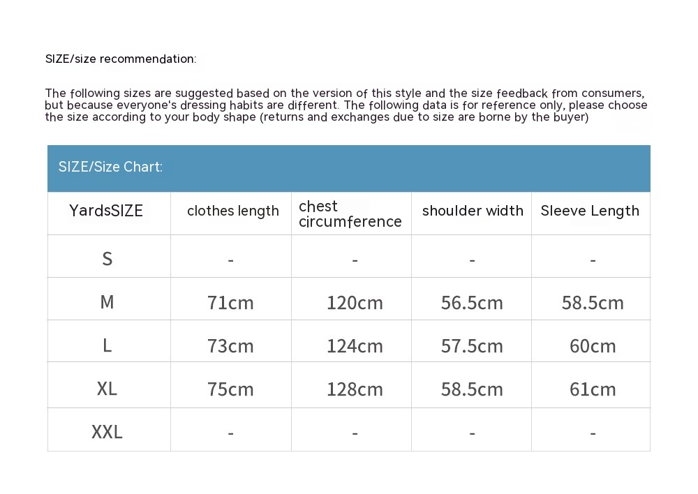 1. Asian sizes are 1 to 2 sizes smaller than European and American people. Choose the larger size if your size between two sizes. Please allow 2-3cm differences due to manual measurement. 2. Please check the size chart carefully before you buy the item, if you don't know how to choose size, please contact our customer service. 3.As you know, the different computers display colors differently, the color of the actual item may vary slightly from the following images.