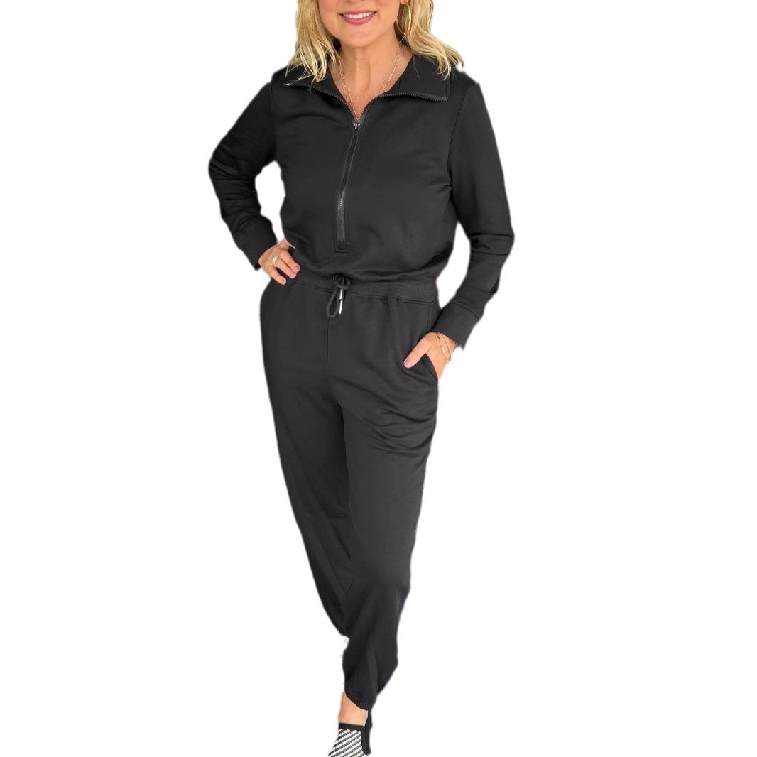 Loose Zip Long Sleeve Polo Collar Jumpsuit Women