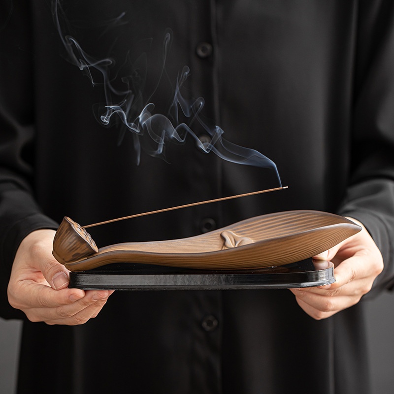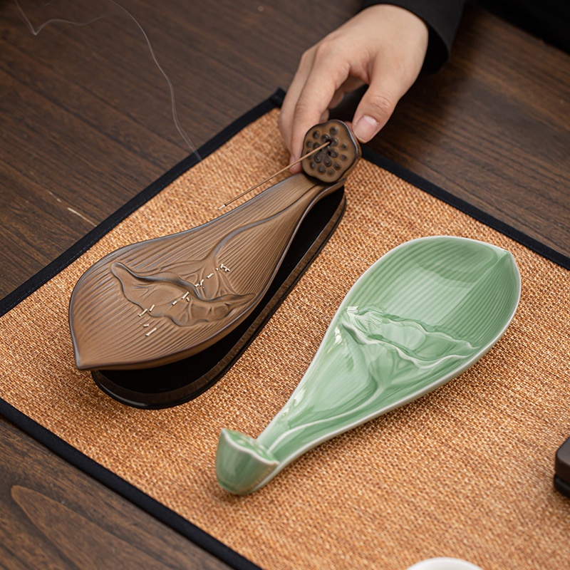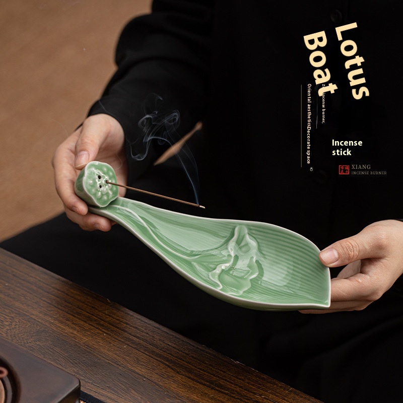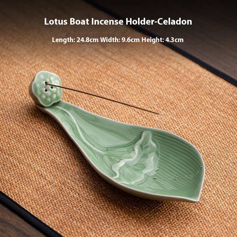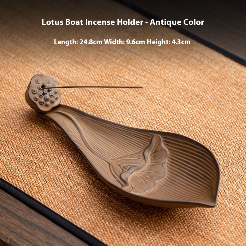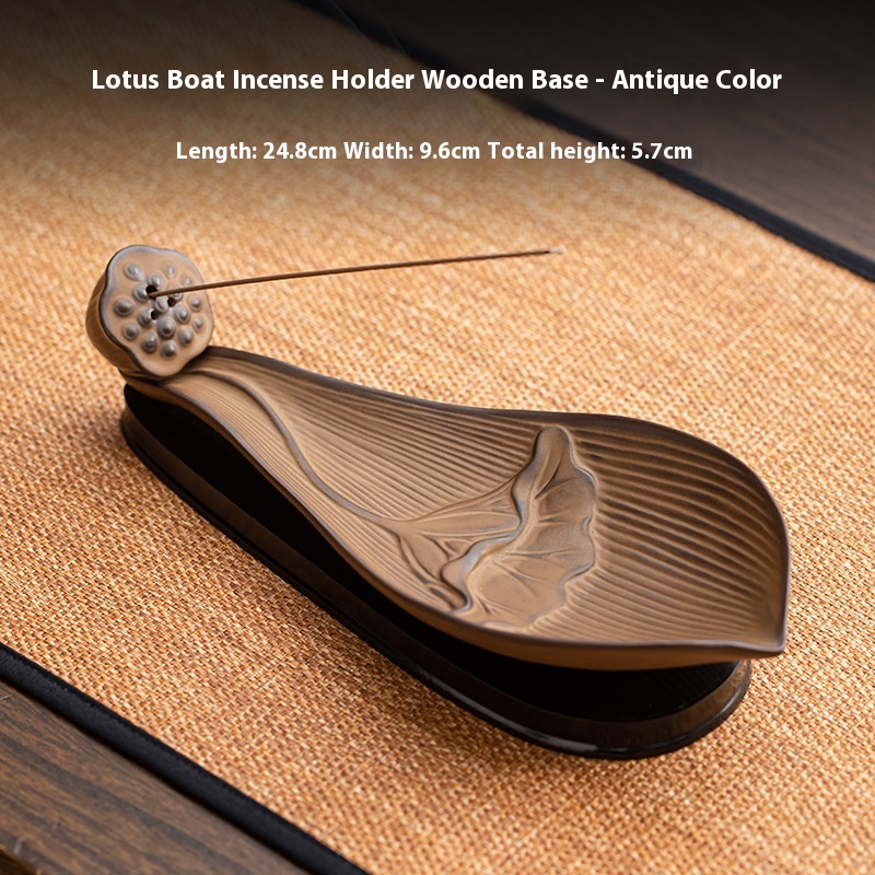 Specifications: Lotus boat incense holder-antique color, Lotus boat incense holder wooden base-antique color, Lotus boat incense holder-celadon, Lotus boat incense holder wooden base-celadon