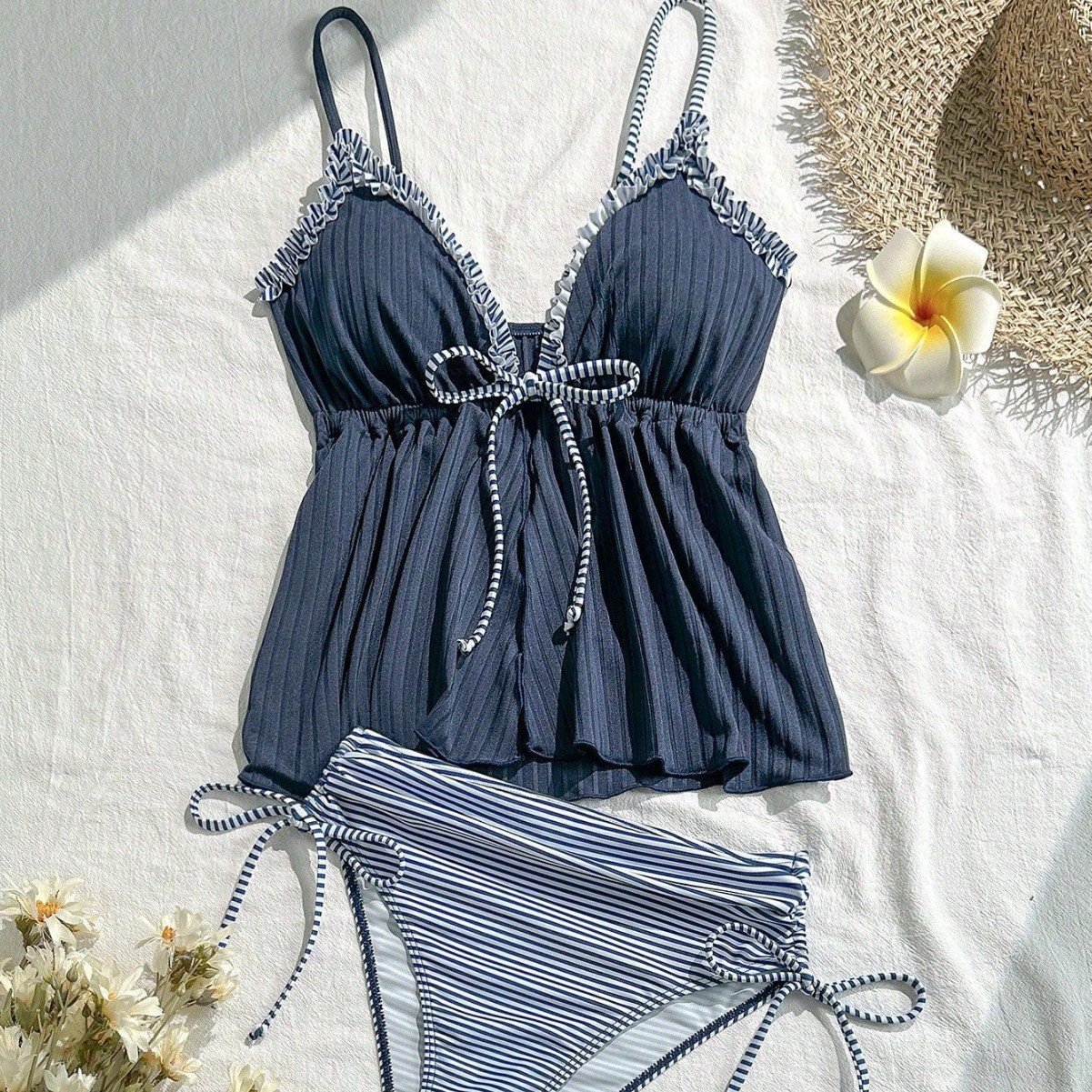 Lotus Leaf-trimmed Two-piece Swimsuit With Shoulder Straps And Lace-up Back