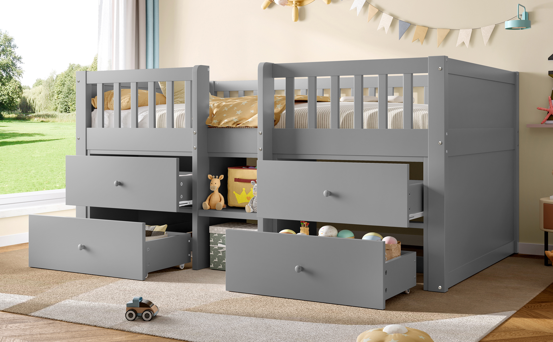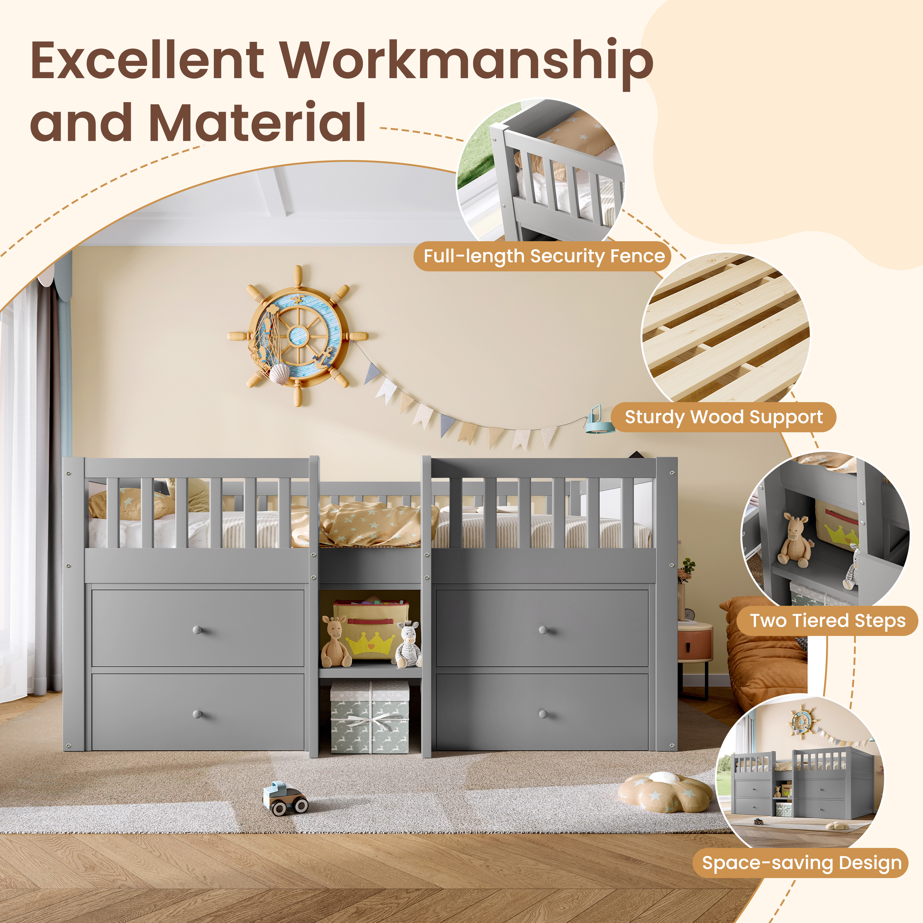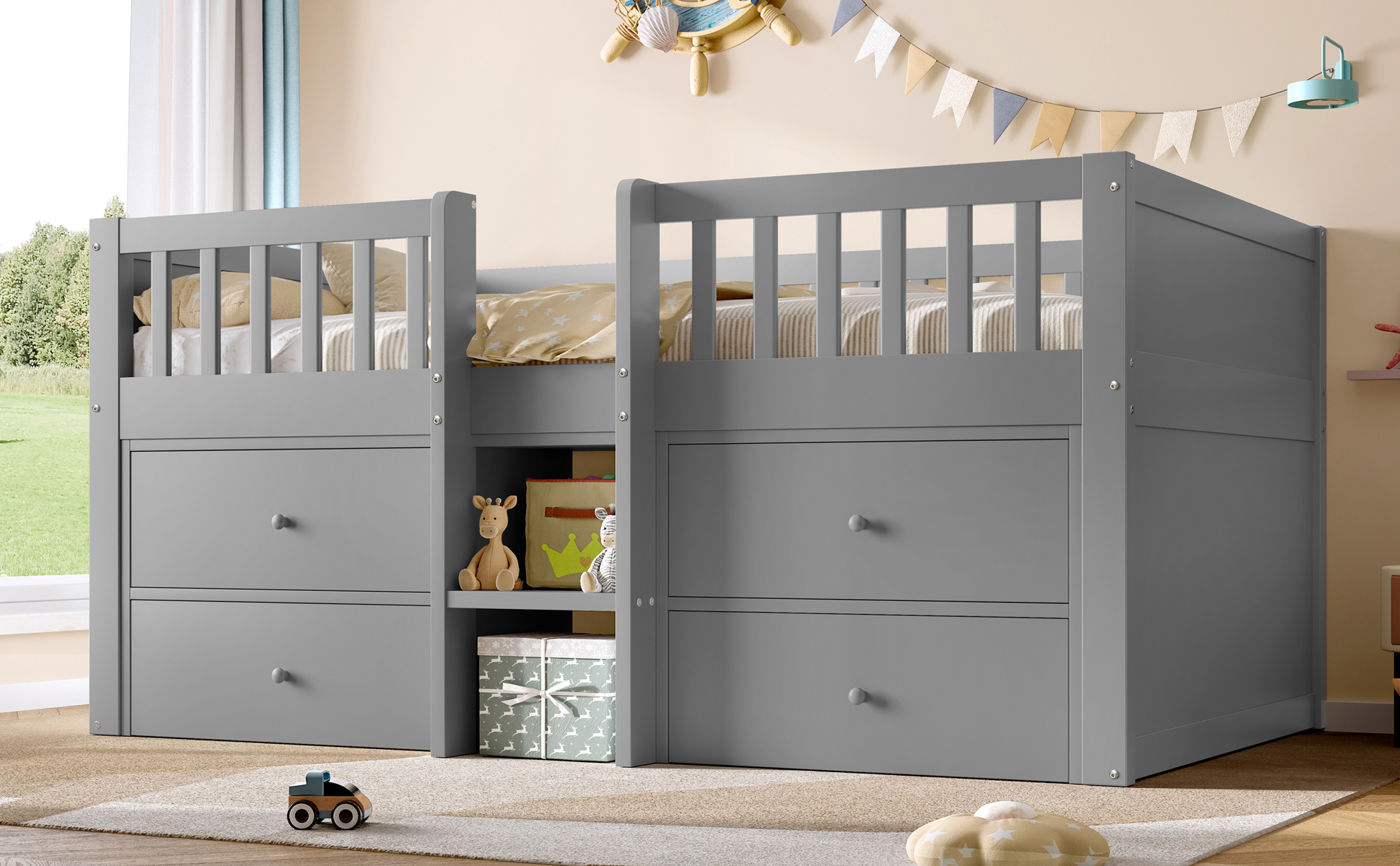 This low loft bed has ample storage space, four storage drawers with easy pull out handle and tiered steps as underbed storage compartment are perfect for you to store quilts, bed sheets and other necessities. Combined full-length security fence, this ensures your child can get in and out of bed safely and comfortably, enhancing security during daily use. Besides, sturdy support and tight connection further enhance stability and provide better support for the whole bed frame. Accommodate storage requirements while presenting a space-saving design in its overall form. The grey coloured design offers a fresh, minimalist aesthetic that blends harmoniously with any decorative style in bedroom, effortlessly creating an ideal space for you. Special Features: - Drawer storage with easy pull out handle - Tiered steps as underbed storage compartment - Full-length security fence - Sturdy wood support - Stylish and space-saving design