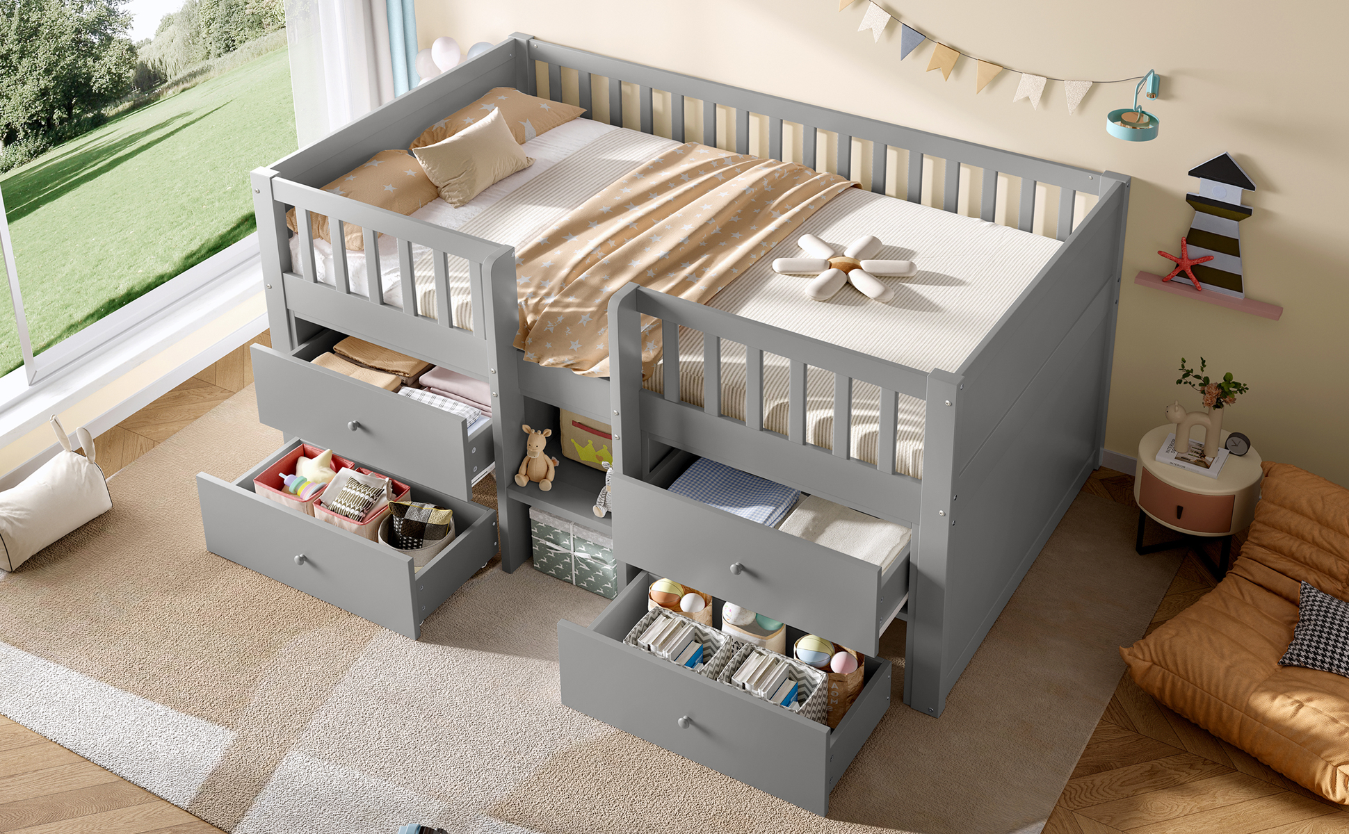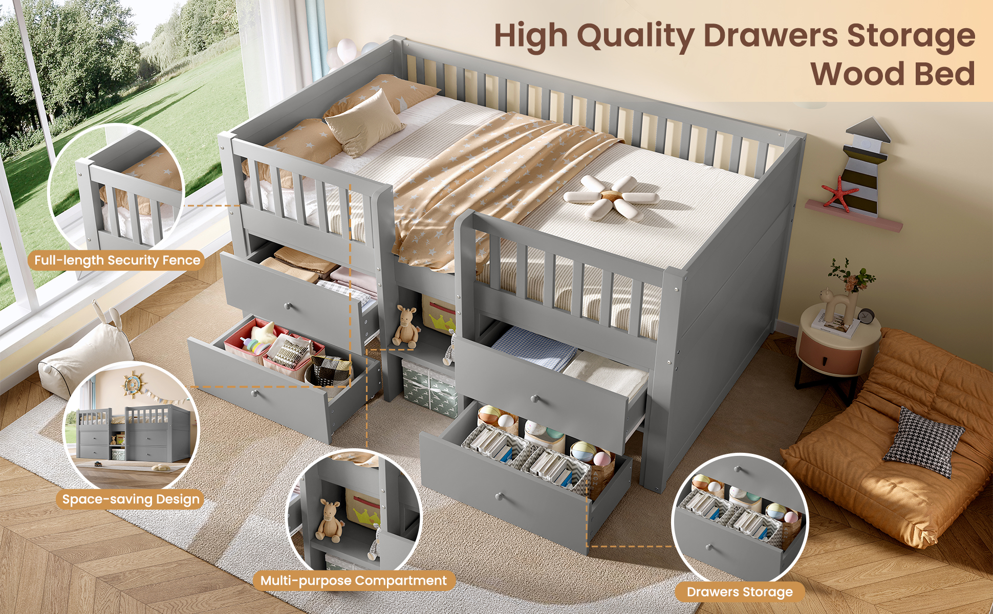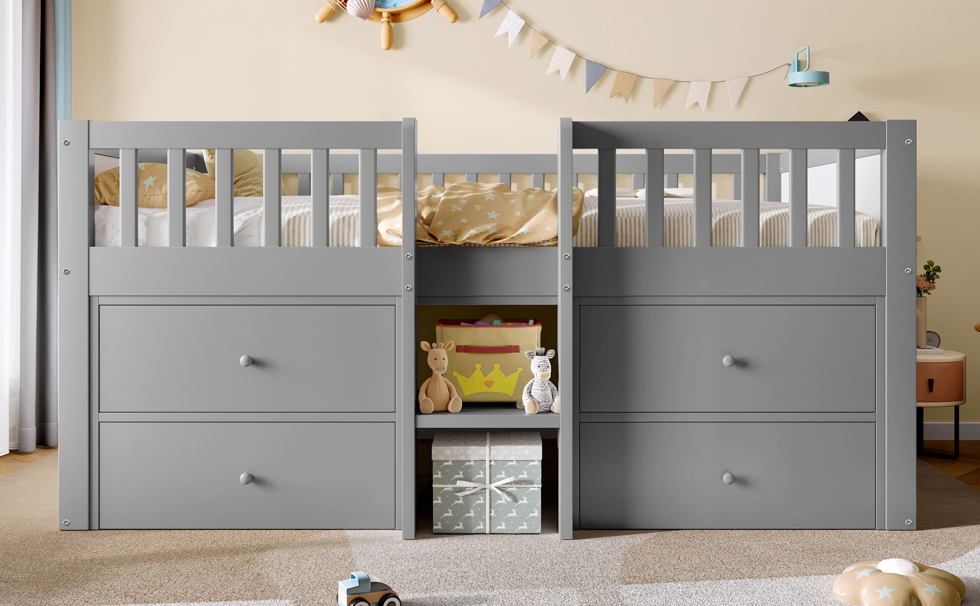 This low loft bed has ample storage space, four storage drawers with easy pull out handle and tiered steps as underbed storage compartment are perfect for you to store quilts, bed sheets and other necessities. Combined full-length security fence, this ensures your child can get in and out of bed safely and comfortably, enhancing security during daily use. Besides, sturdy support and tight connection further enhance stability and provide better support for the whole bed frame. Accommodate storage requirements while presenting a space-saving design in its overall form. The grey coloured design offers a fresh, minimalist aesthetic that blends harmoniously with any decorative style in bedroom, effortlessly creating an ideal space for you. Special Features: - Drawer storage with easy pull out handle - Tiered steps as underbed storage compartment - Full-length security fence - Sturdy wood support - Stylish and space-saving design