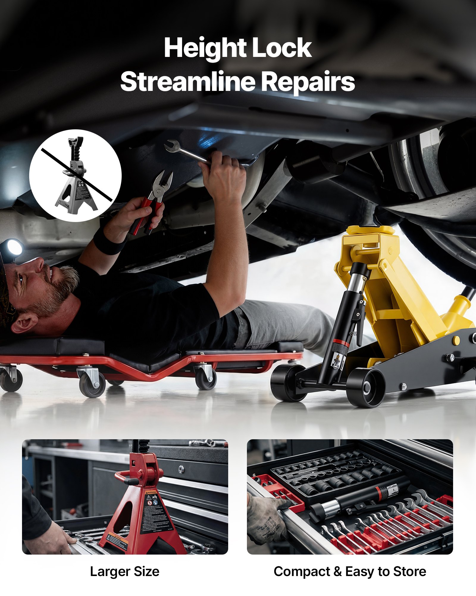 Floor Jack & Support Rod Kit: Our low profile floor jack includes a telescopic support rod, providing 8 height settings (11.6–18.5 in / 295–470 mm). It serves as a jack stand, allowing the jack to stay height-locked while you work safely under the vehicle