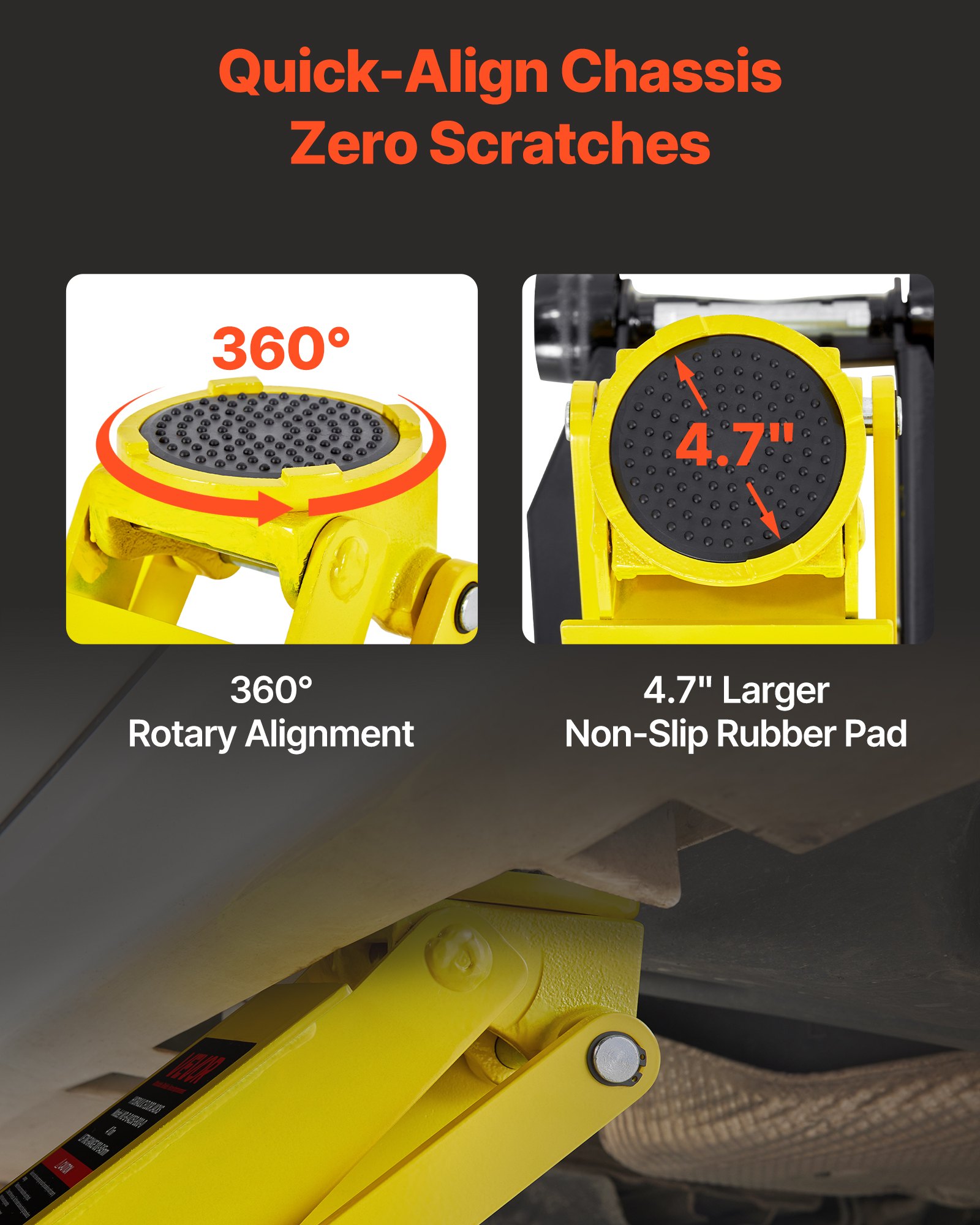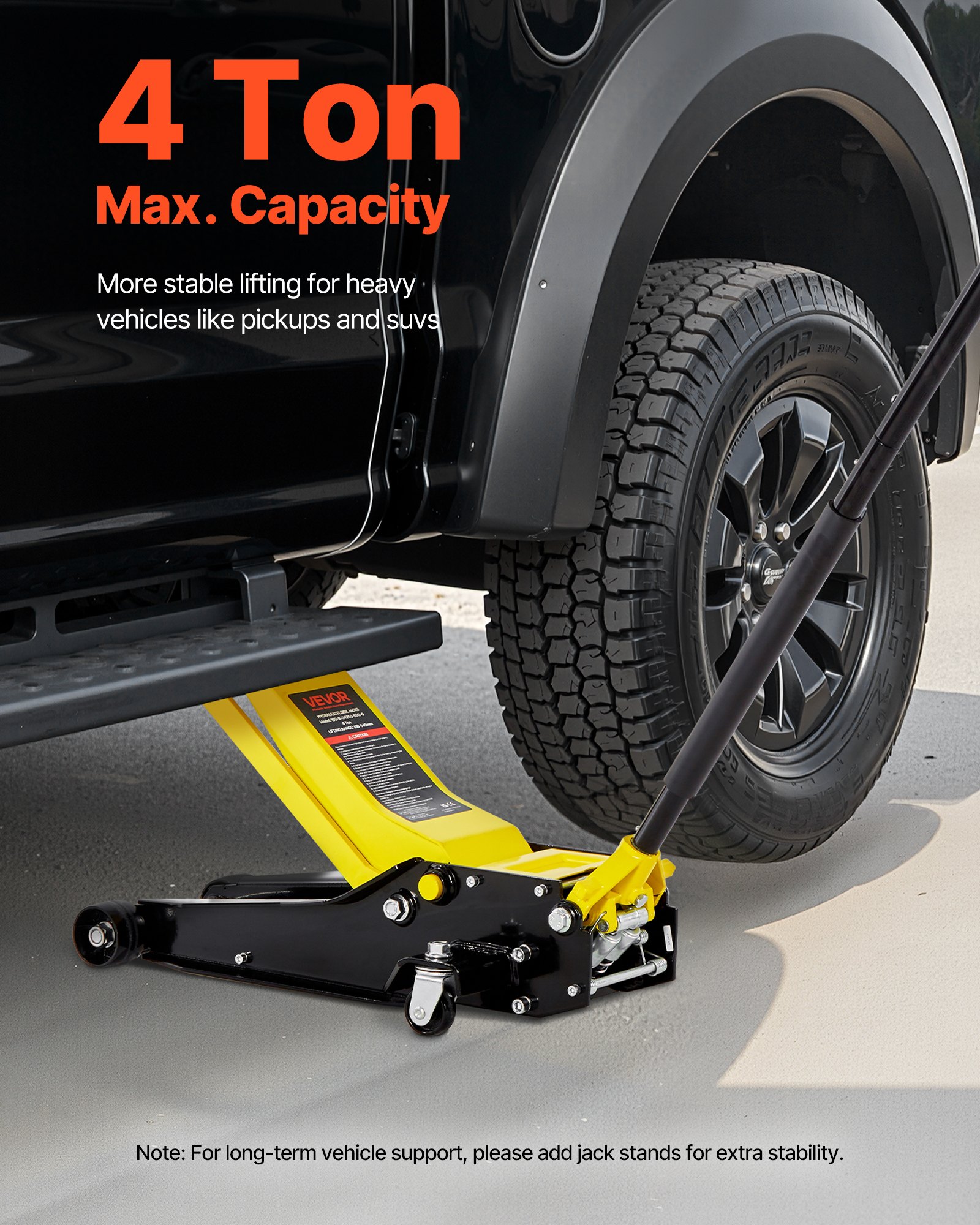 4 Ton Max Capacity: Our low profile floor jack lifts sports cars, sedans, light pickups, and SUVs up to 4 ton/8,818 lbs for tire changes, repairs, and cleaning. It's ideal for pros or DIYers. Note: For long maintenance, use a jack stand