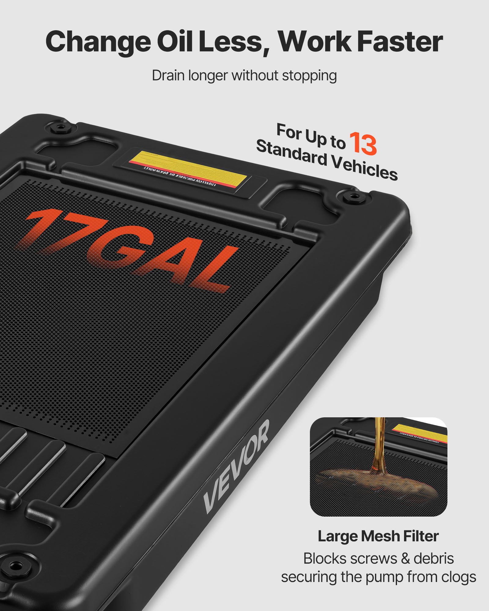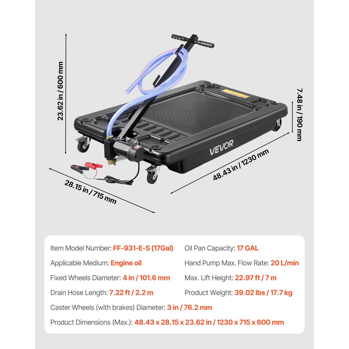 Large 17-Gallon Capacity: The 17-gallon oil drain pan stores oil from multiple vehicles at once. A 2.2 m hose provides smooth, steady draining, making it ideal for shops, farms, and long work sessions