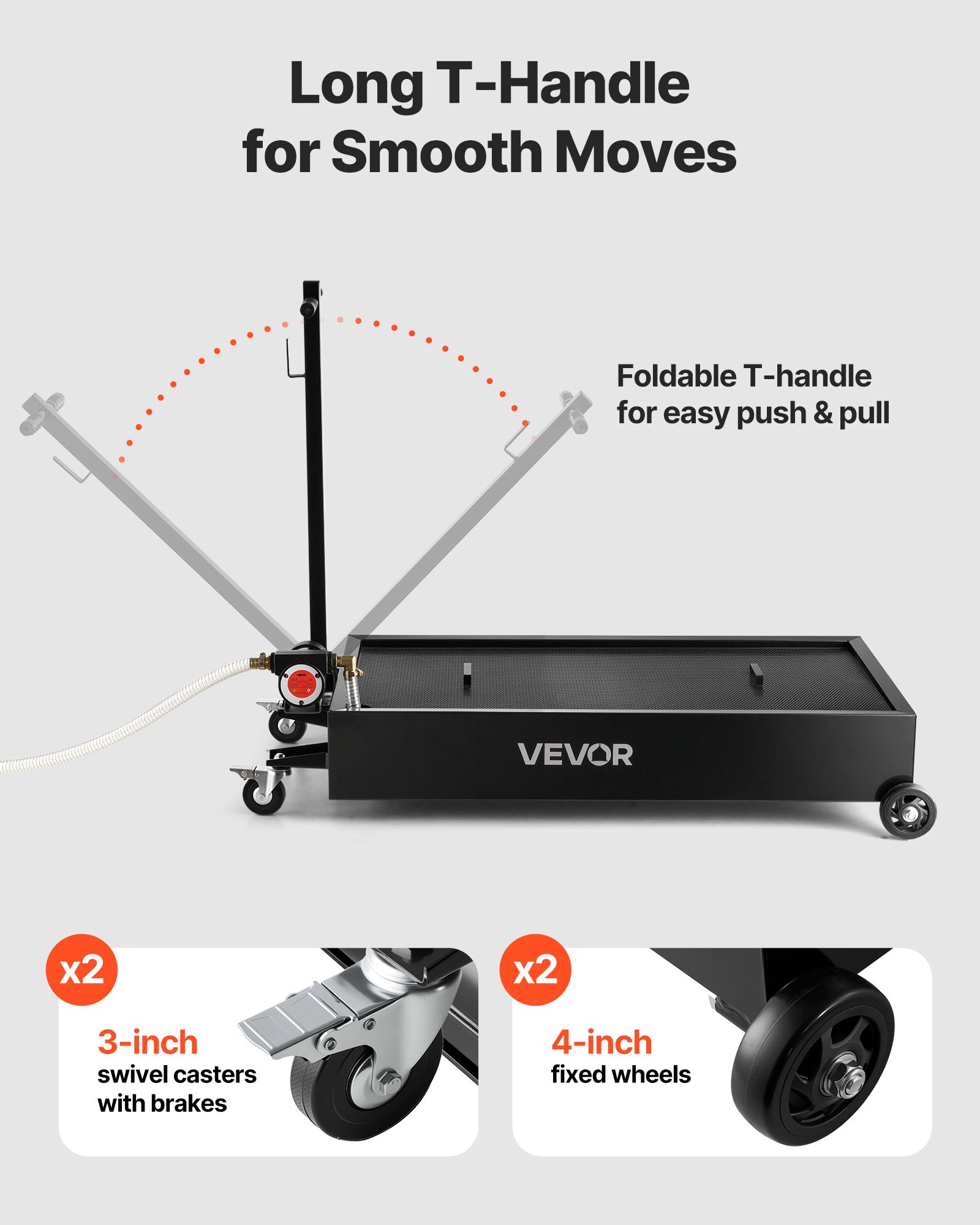 Easy to Move Full: Four wheels, including two 3 in swivel casters with brakes and two 4 in fixed wheels, make our oil drain cart smooth to roll when full. A foldable T-handle adds flexible steering