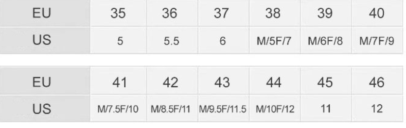 Size 35, 36, 37, 38, 39, 40, 41, 42, 43, 44, 45, 46