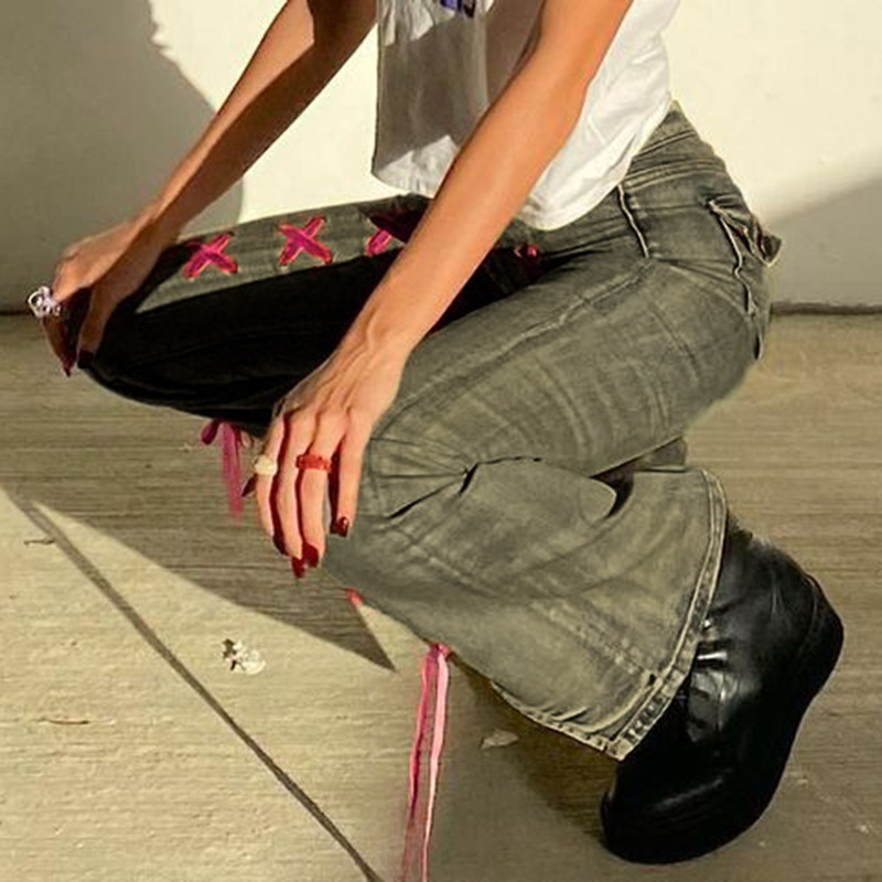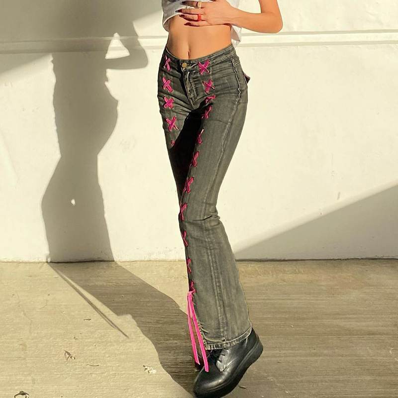 Low Waist Slim Jeans Contrast Color Lace-up