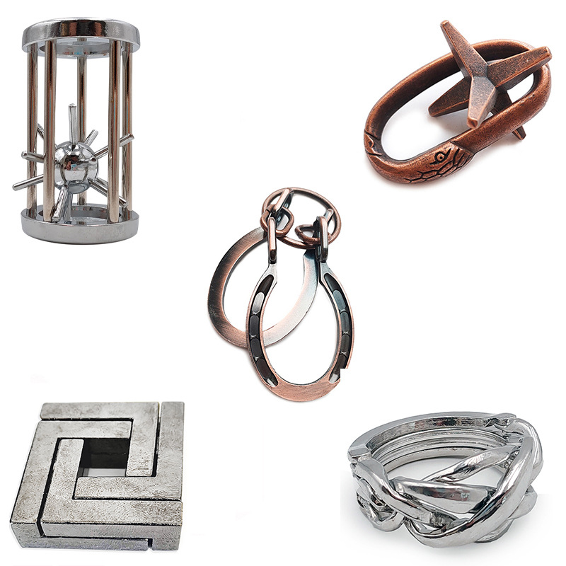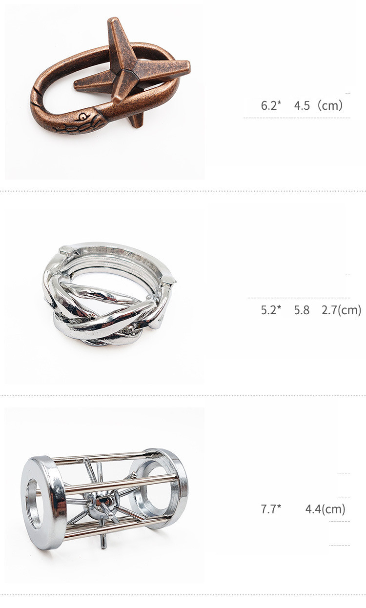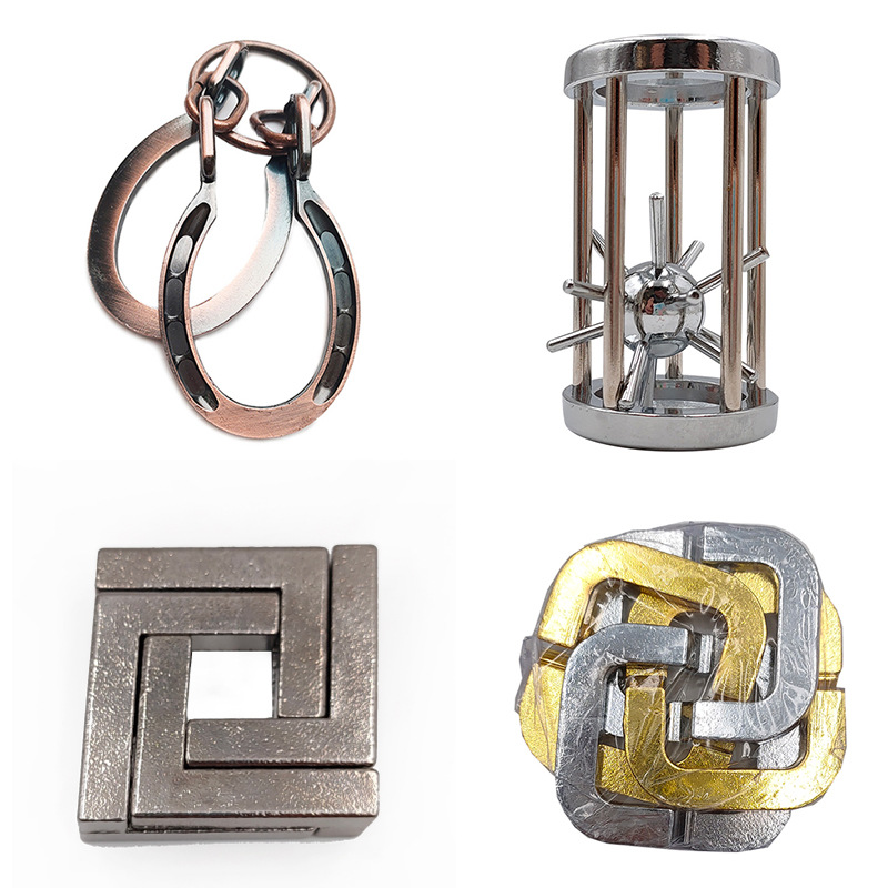 Color: four piece set A (4C+four square lock+horseshoe+cage star), four piece set B (southeast box+four square lock+horseshoe+cage star), five piece set (four square lock+horseshoe+cage star+snake exit escape+ring), six piece set A (4C+three chain+horseshoe+four square lock+cage star+ring), six piece set B (4C+southeast box+horseshoe+four square lock+cage star+snake exit escape), six piece set for entry (ox head+key+dulcimer+snake exit escape+heart+maze)