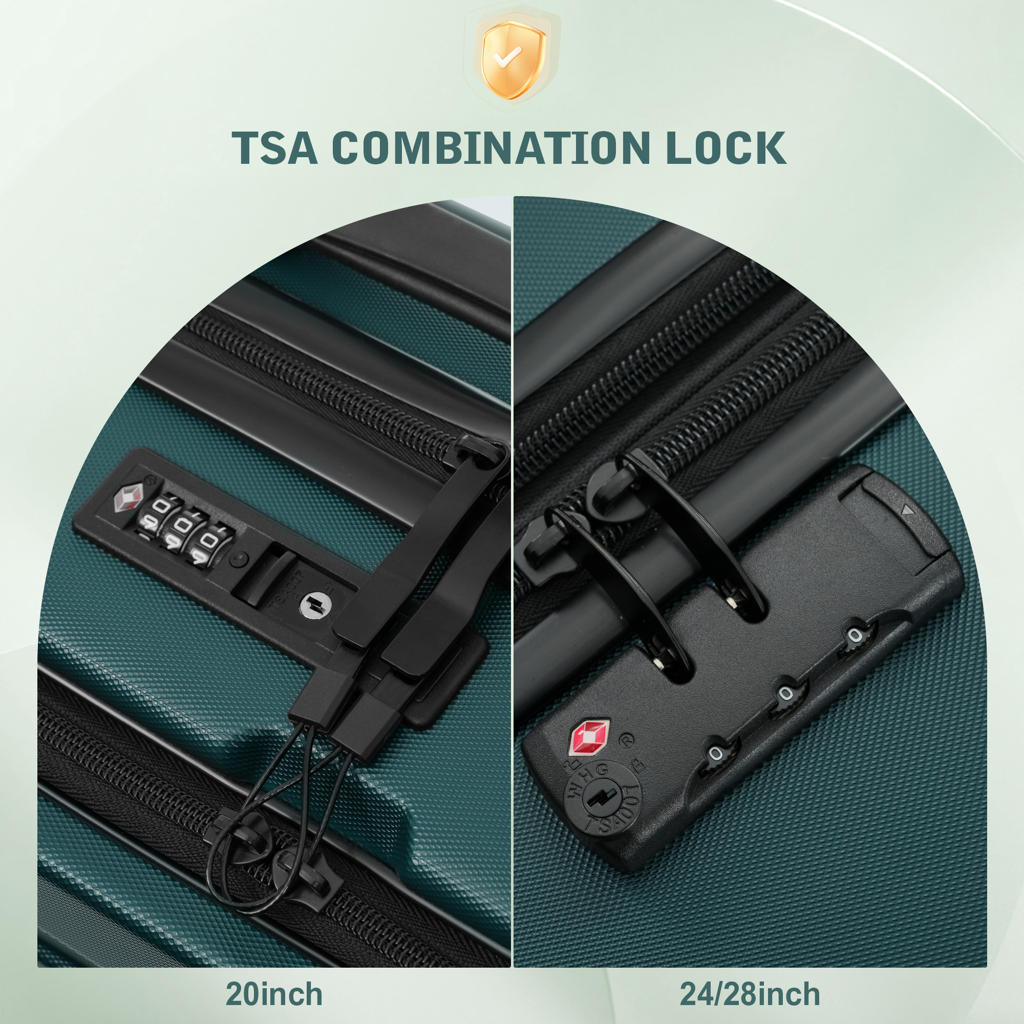 20-inch Exclusive Accessories: Front-opening design with multiple internal compartments USB port with built-in charging cable 24-inch & 28-inch Suitcase Accessories: Side carry handle Expansion layer Common Accessories for All 3 Sizes: 3-stage telescopic handle Double 360° spinner wheels TSA-approved lock Top carry handle Internal divider compartments Descriptions Instructions for Reset the 3 Digit Secure TSA Lock--20 inch The original combination is 0-0-0. To set your own combination, please follow these steps: 1) With the lock in the 0-0-0 position. 2) Press down the reset button [A] with a pen or other tool until you hear a "click"sound. 3) Set your own combination by turning the dials [B]. For example, 8-8-8. 4) Push the button [C] in the direction of the arrow until you hear the "click"sound again, confirming that you have set your personal combination. Instructions for Reset the 3 Digit Secure TSA Lock--24 & 28 inch 1. The initial password of lock is 0-0-0. 2.Press the reset hole with the tip of the pen. 3.Set the new 3-digit code while pressing. 4.Now you can open the lock with the new password.