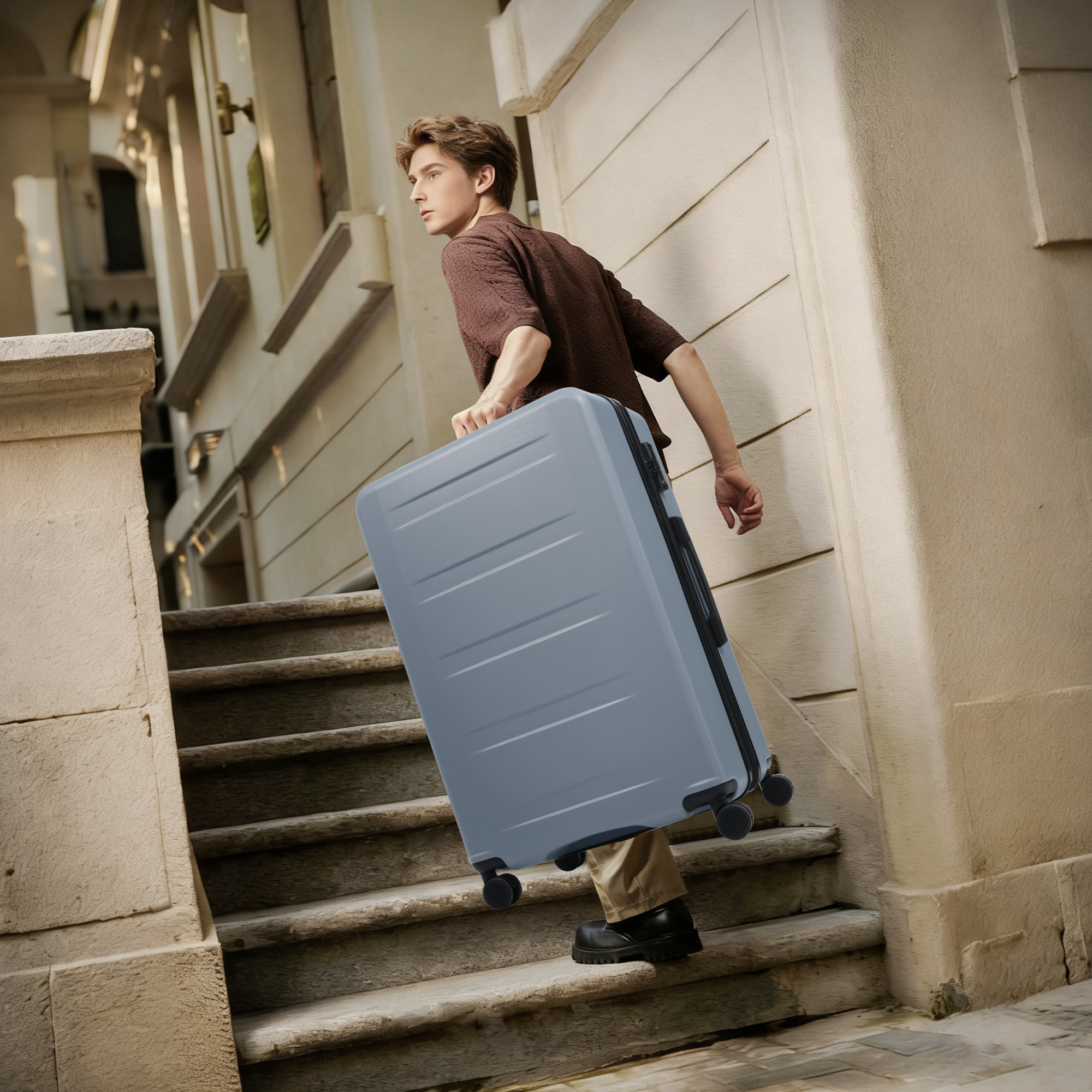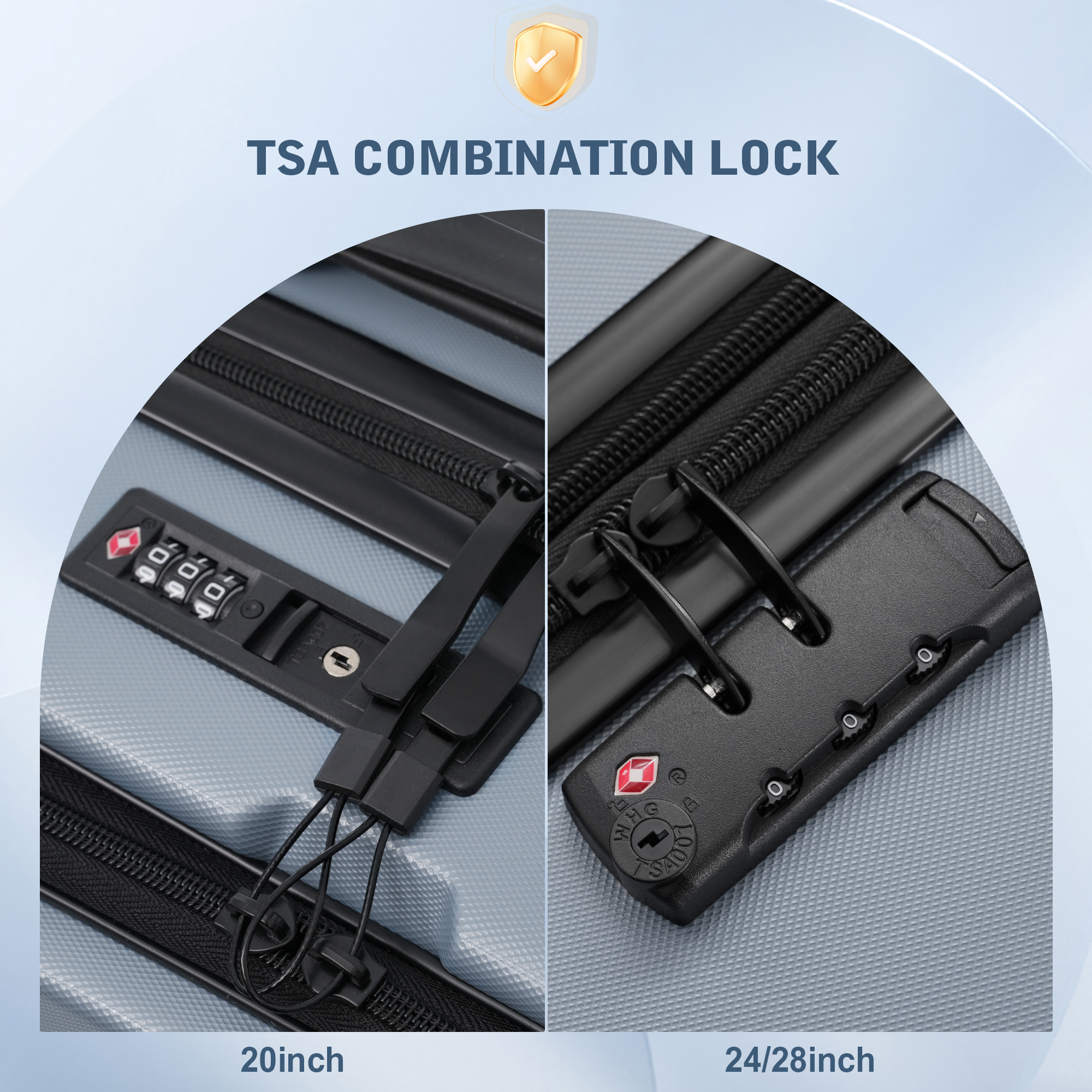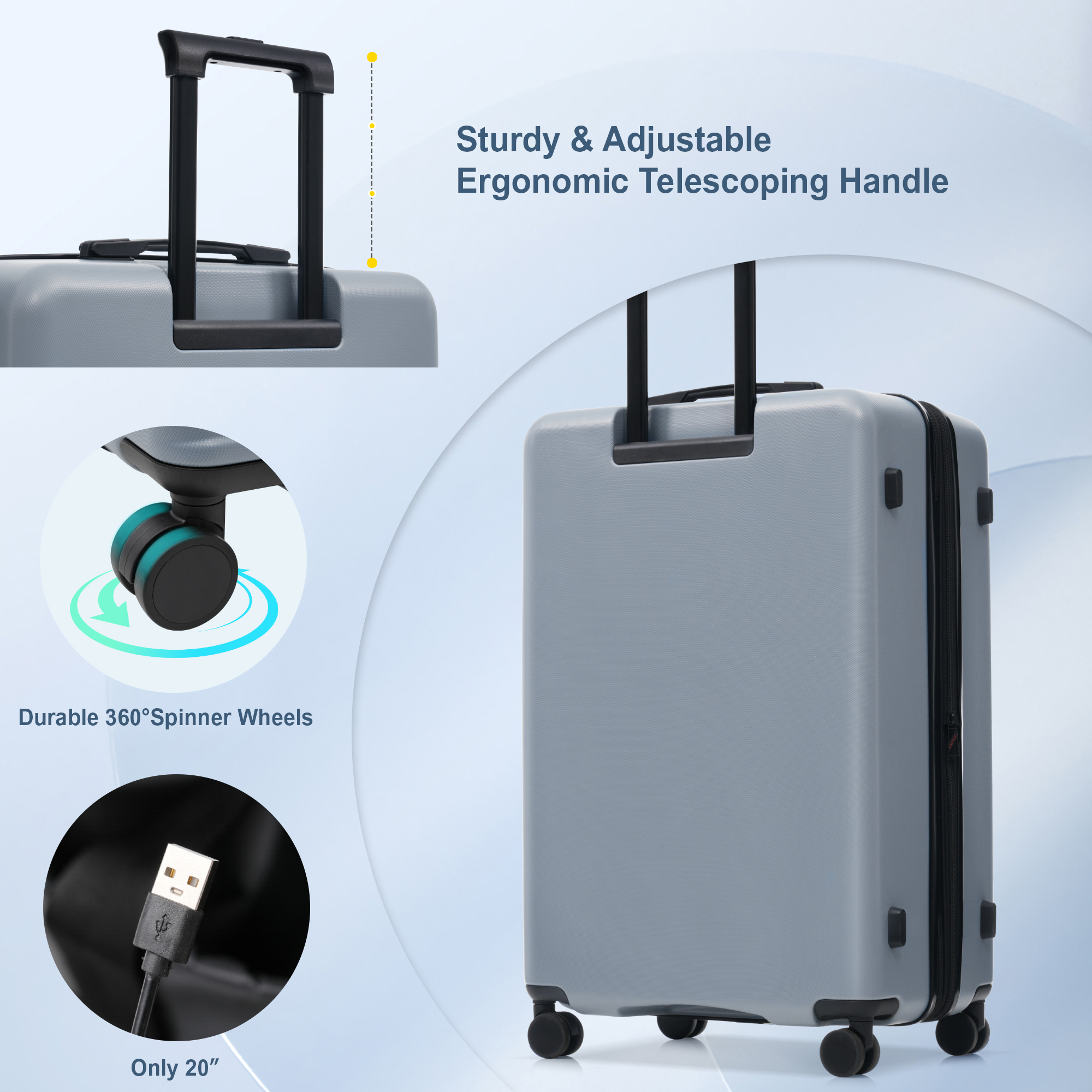 20-inch Exclusive Accessories: Front-opening design with multiple internal compartments USB port with built-in charging cable 24-inch & 28-inch Suitcase Accessories: Side carry handle Expansion layer Common Accessories for All 3 Sizes: 3-stage telescopic handle Double 360° spinner wheels TSA-approved lock Top carry handle Internal divider compartments Descriptions Instructions for Reset the 3 Digit Secure TSA Lock--20 inch The original combination is 0-0-0. To set your own combination, please follow these steps: 1) With the lock in the 0-0-0 position. 2) Press down the reset button [A] with a pen or other tool until you hear a "click"sound. 3) Set your own combination by turning the dials [B]. For example, 8-8-8. 4) Push the button [C] in the direction of the arrow until you hear the "click"sound again, confirming that you have set your personal combination. Instructions for Reset the 3 Digit Secure TSA Lock--24 & 28 inch 1. The initial password of lock is 0-0-0. 2.Press the reset hole with the tip of the pen. 3.Set the new 3-digit code while pressing. 4.Now you can open the lock with the new password.