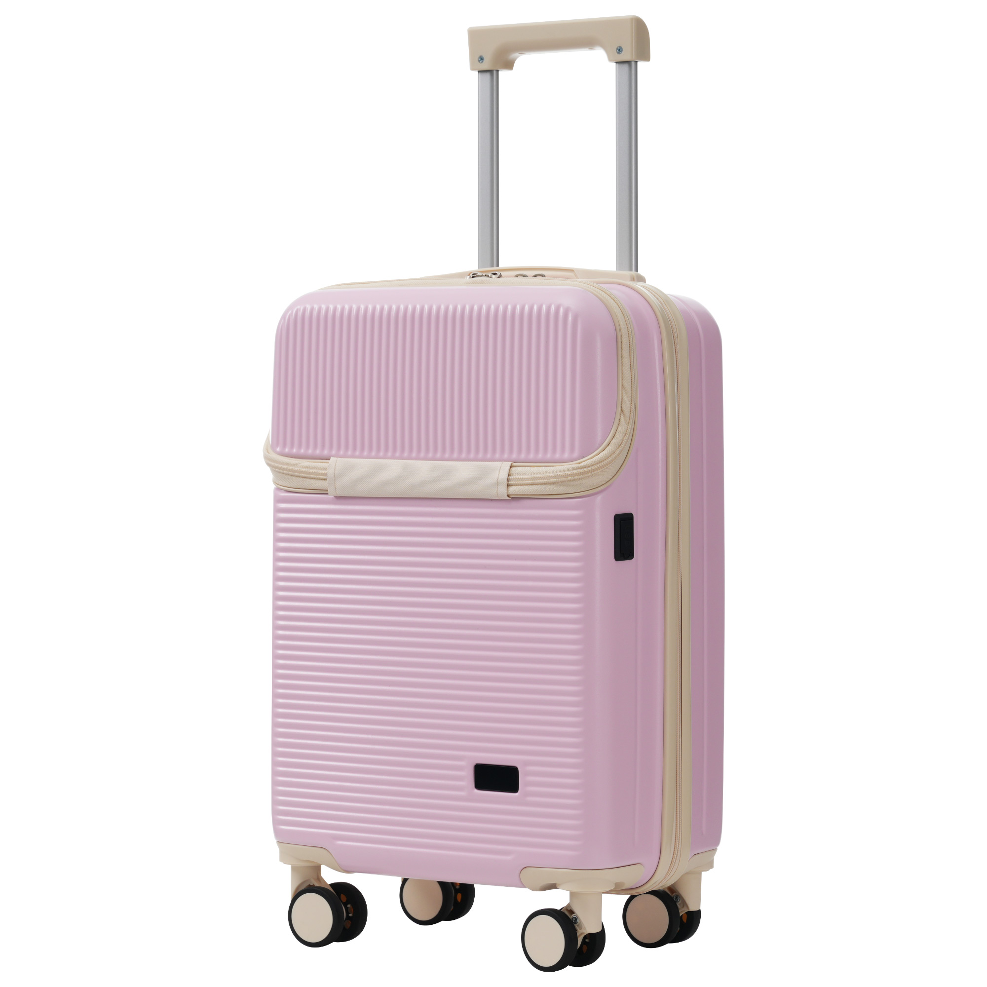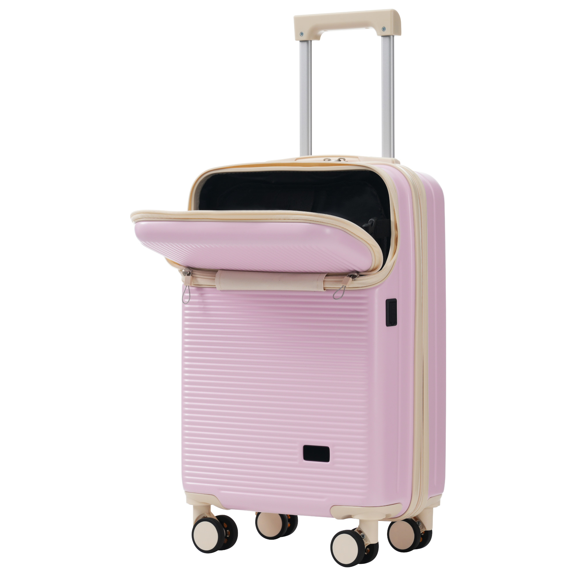 - 2.This 20-inch suitcase features a front half-opening design, facilitating quick and easy access to a computer or other commonly used devices. The front compartment of the hard-shell carry-on luggage set includes a compartment for storing computers, zippered compartments, and mesh pockets, providing ample storage for a variety of items. It also features a built-in data cable that can be connected to a power bank inside the luggage. (Note:The 20-inch suitcase cannot be expanded)