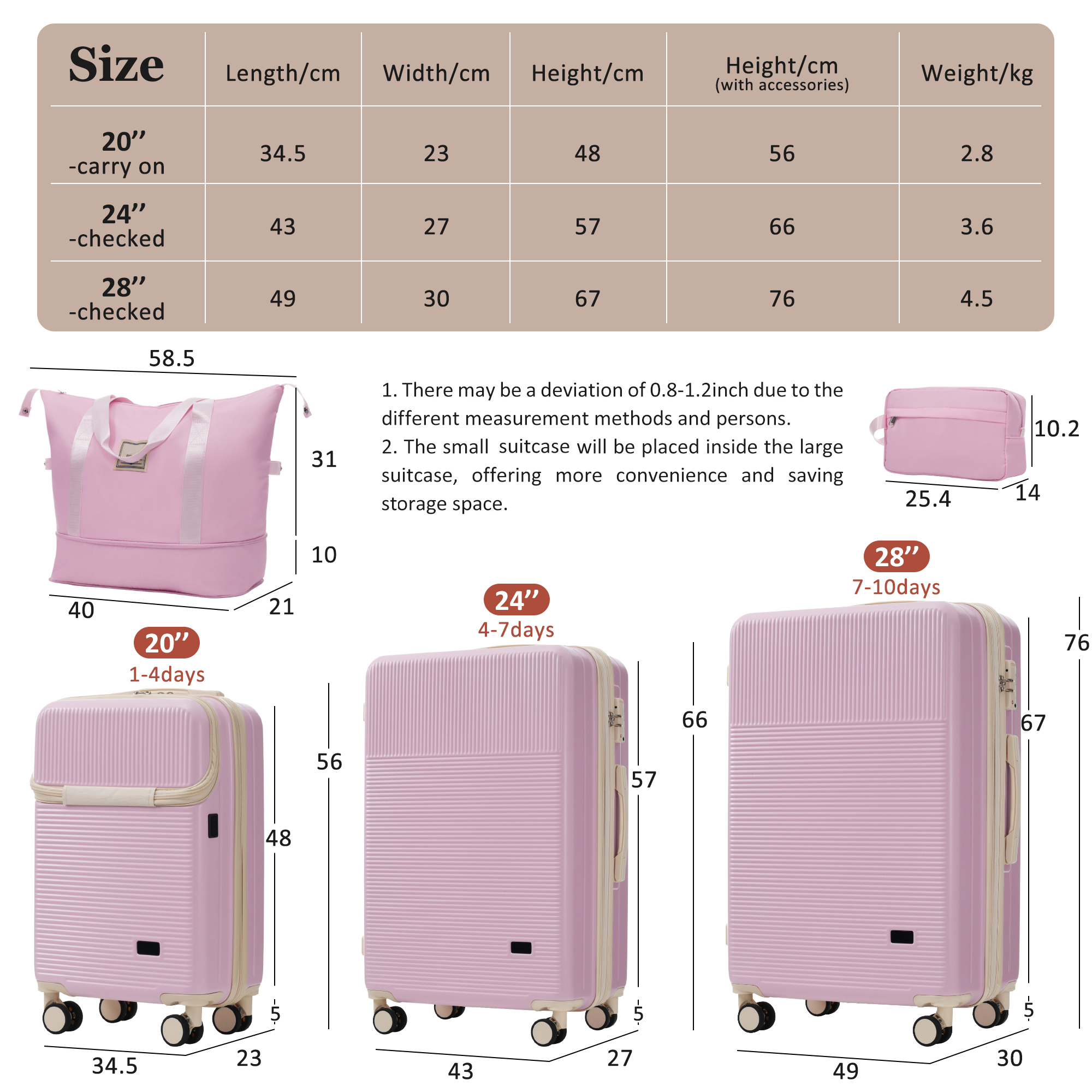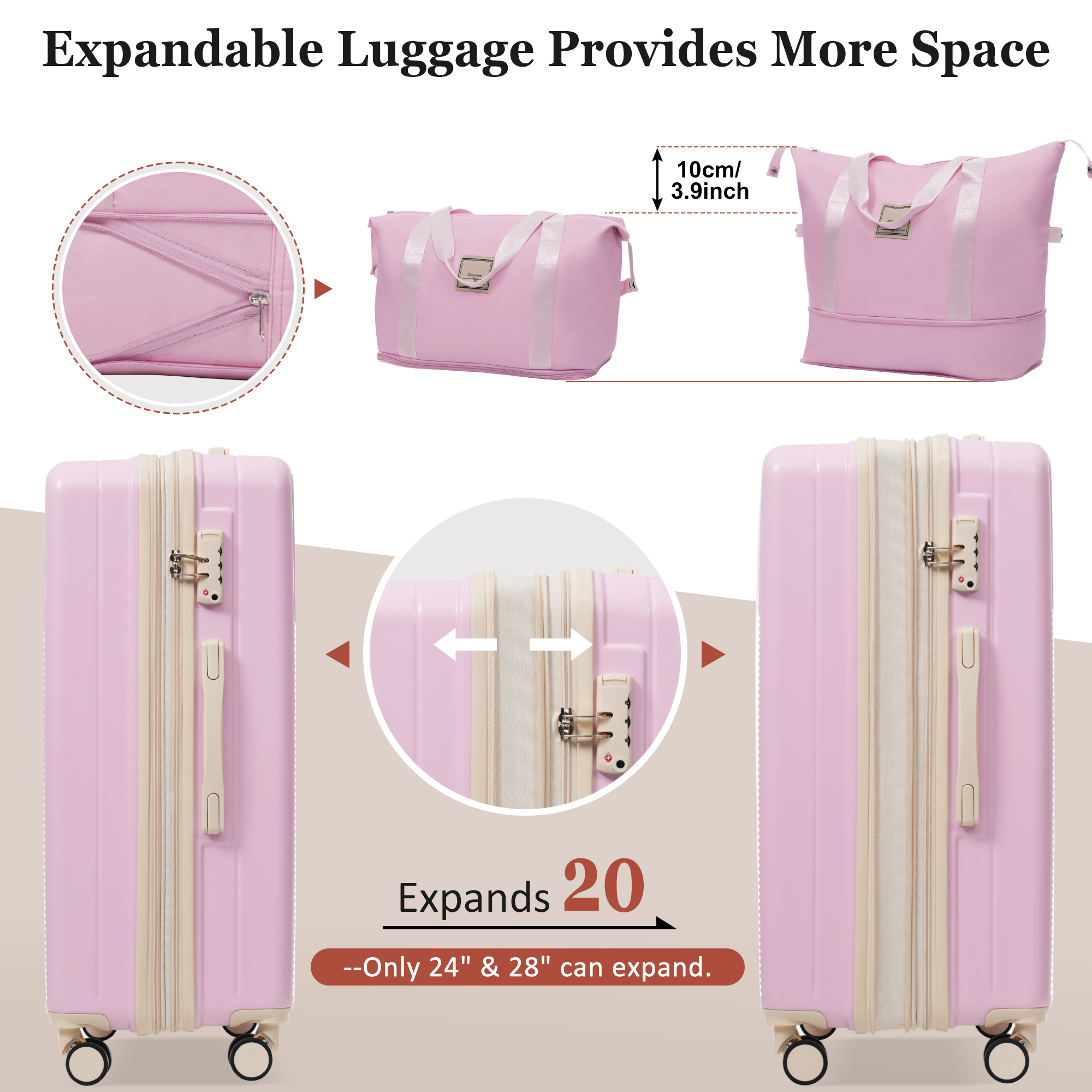 - 5.This expandable handbag can be fixed on a trolley, It also comes with multiple independent pockets, allowing for the storage of more personal items. The toiletry bag can store cosmetics and toiletries, which can effectively classify and store clothes and cosmetics,small suitcase will be placed inside the large suitcase,offering more convenience and saving storage space.