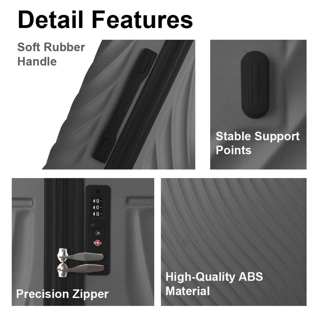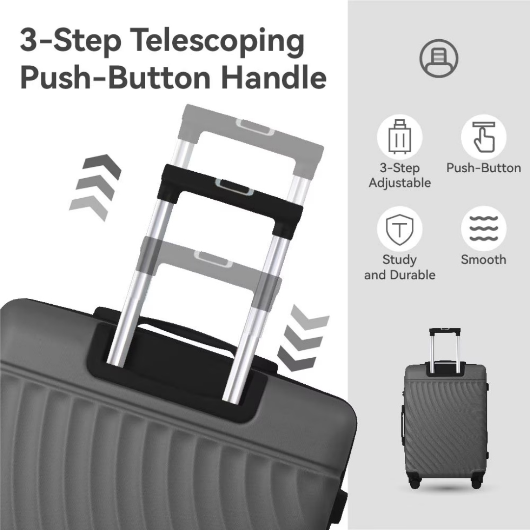 Nested Design: This 3-piece luggage set features a nested design with a 20" carry-on, 24", and 28" checked sizes, available to meet various travel needs.
