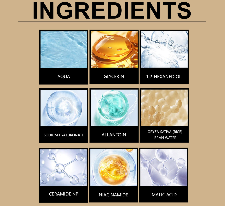 Ingredients: Water, Glycerin, 1,2-Hexanediol, Sodium Hyaluronate, Allantoin, Rice Bran Water, Ceramides, Niacinamide, Malic Acid
