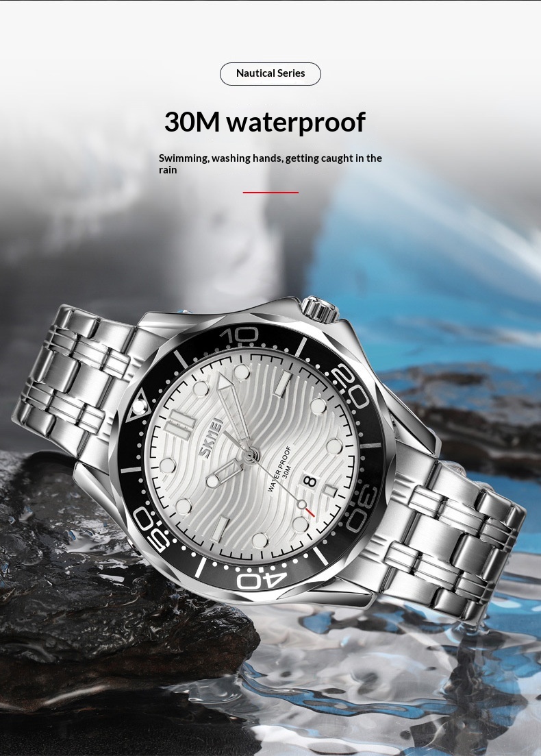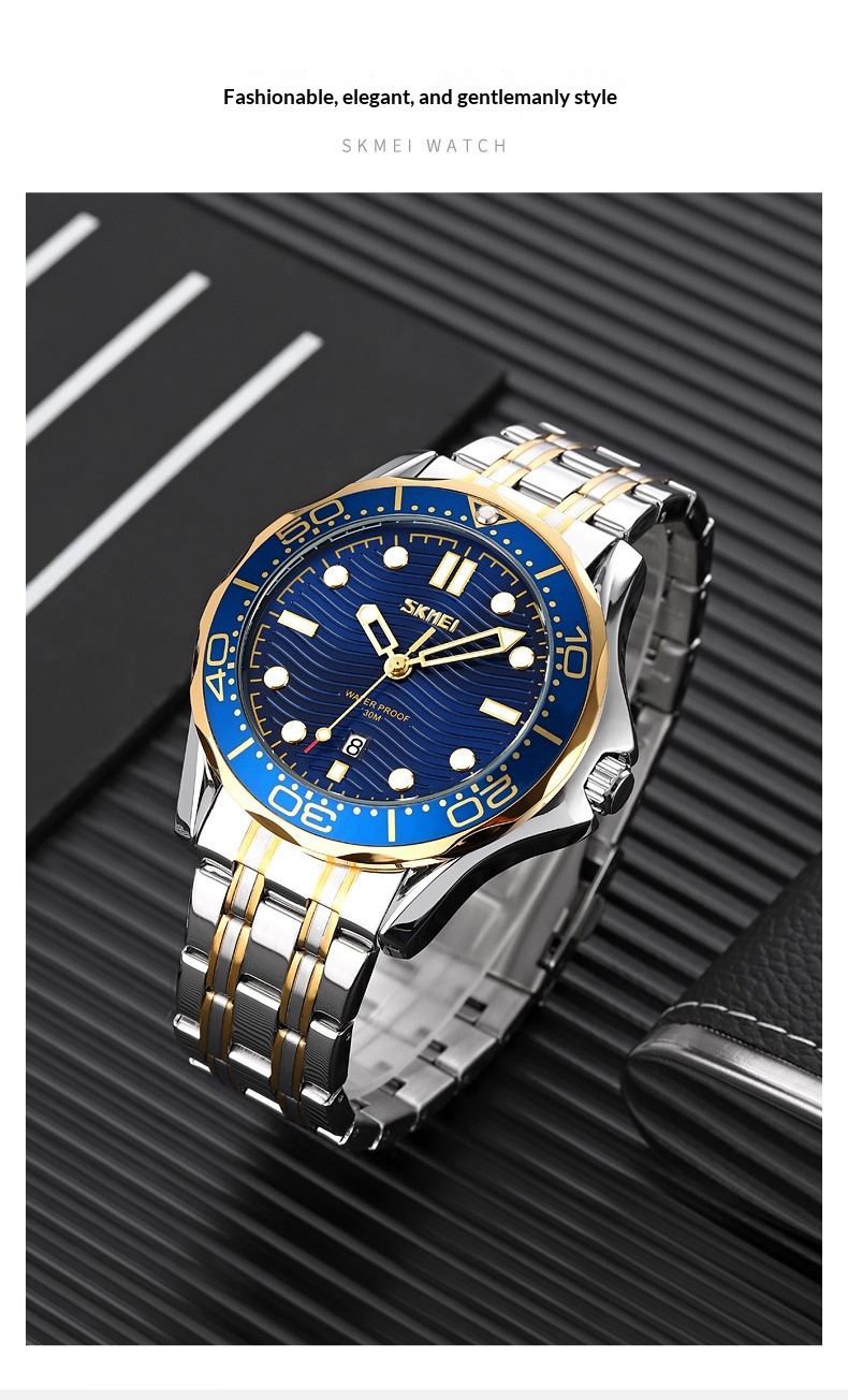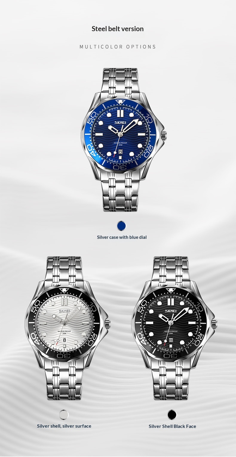 Colors: Silver dial with black face/stainless steel bracelet, silver dial with blue face/stainless steel bracelet, silver dial with white face/stainless steel bracelet, black dial/rubber strap, blue dial/rubber strap, silver dial/rubber strap, two-tone case with silver dial/stainless steel bracelet, two-tone case with black dial/stainless steel bracelet, two-tone case with blue dial/stainless steel bracelet