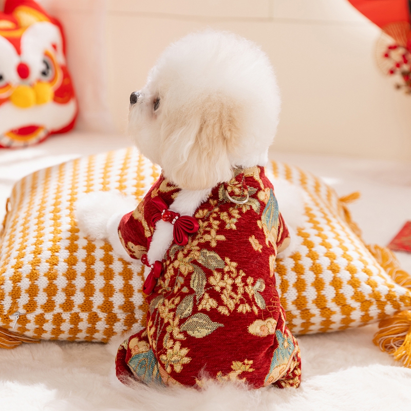 Celebrate Lunar New Year in style with this Exquisite Brocade Pet Jumpsuit! Available in red and beige brocade patterns, each jumpsuit features traditional Chinese knot buttons, plush faux fur trim, and intricate floral-gold motifs. The full-body design ensures warmth and comfort, while the cultural details make it perfect for festive gatherings or traditional events. Let your furry companion embrace the holiday spirit with elegance and authenticity, combining heritage, coziness, and trendiness in one irresistible outfit. A must-have for pet parents looking to infuse Lunar New Year traditions into their pet’s wardrobe!