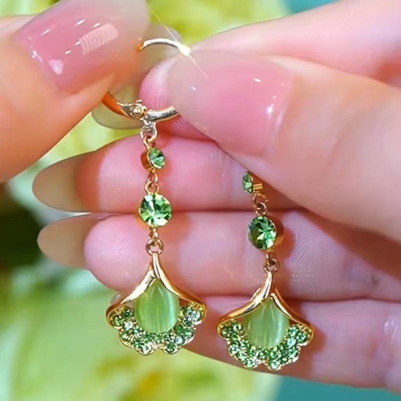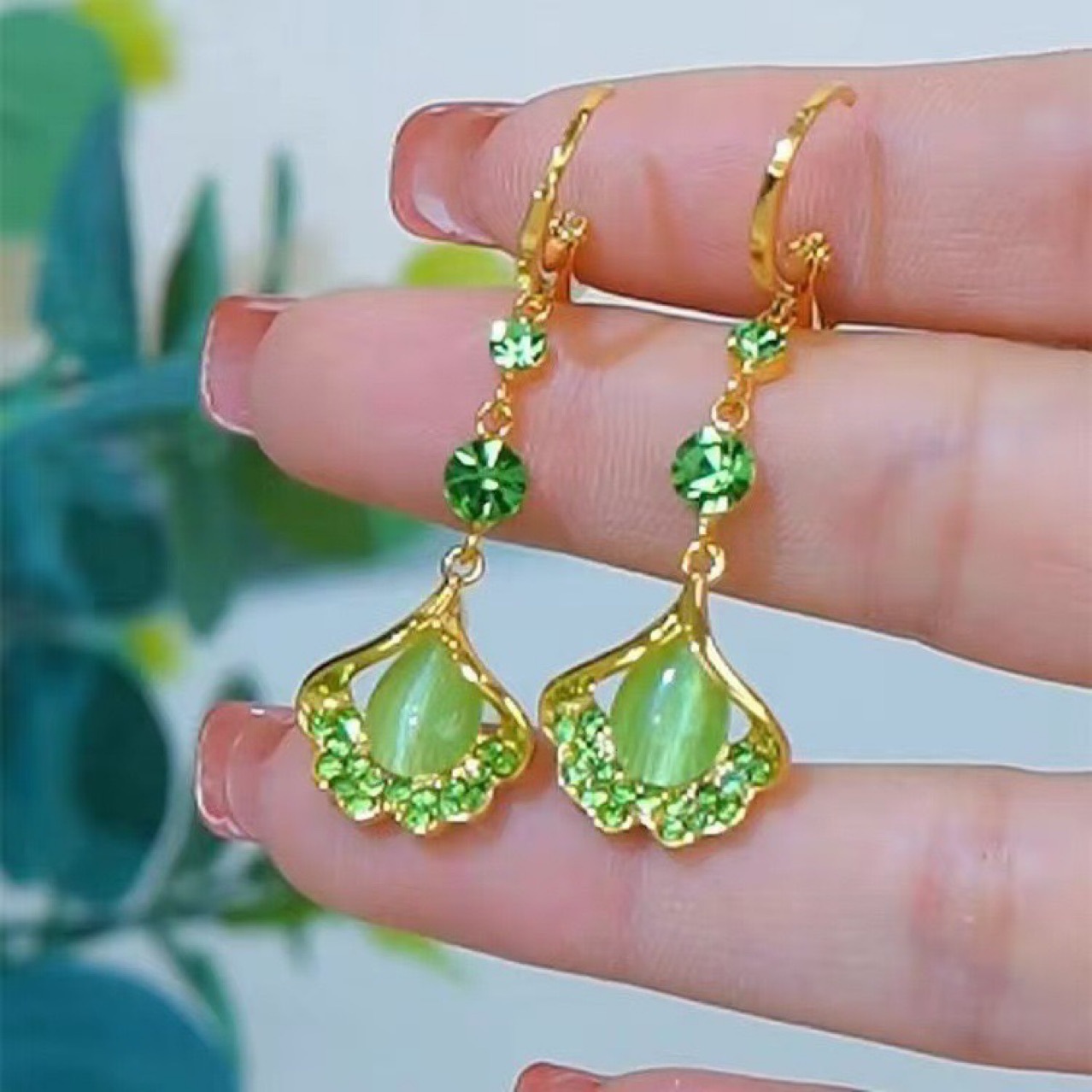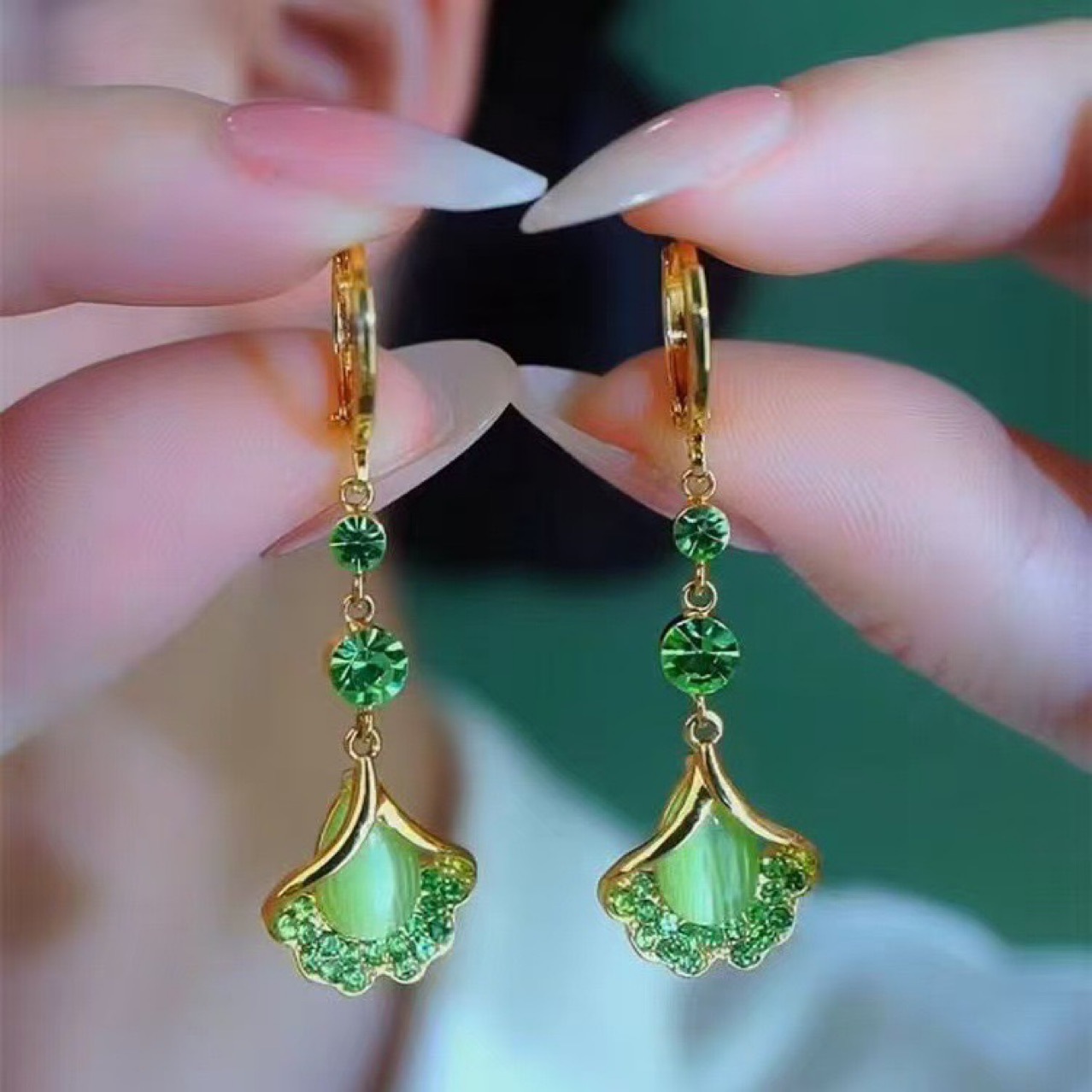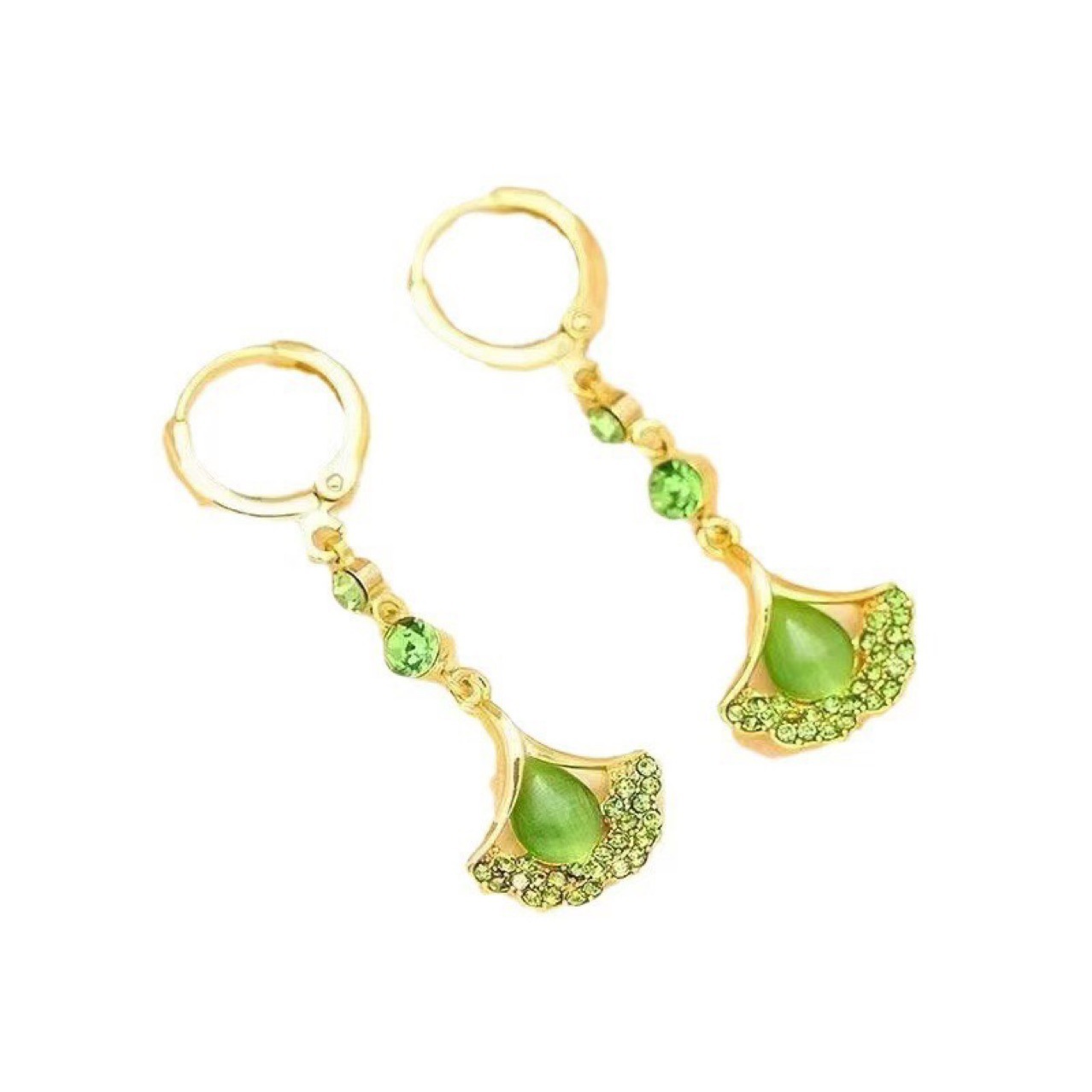 Luxury High-end Green Ginkgo-leaf Cats-eye Stone Long Tassel Earrings