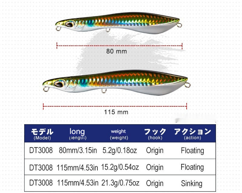 Specifications: 80mm5.2g floating water, 115mm15.2g floating water, 115mm 21.3g submerged water
