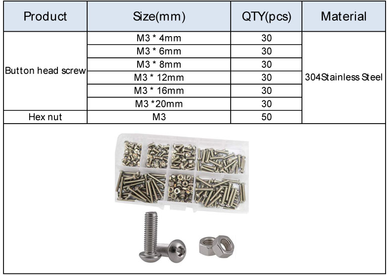 Specifications: M3 round head hexagon socket screw set with 230pcs nuts