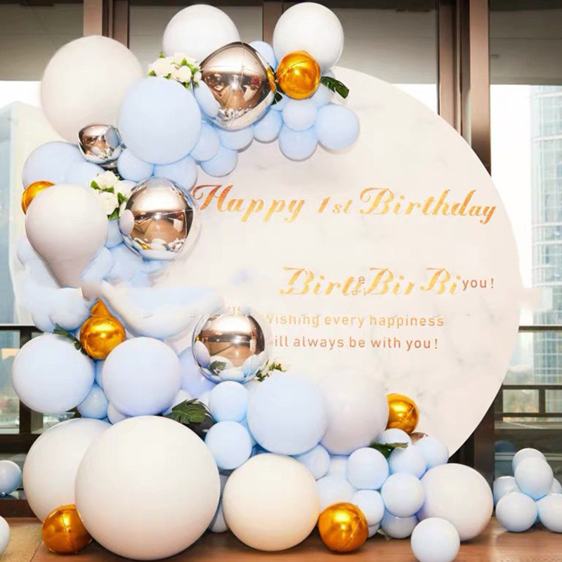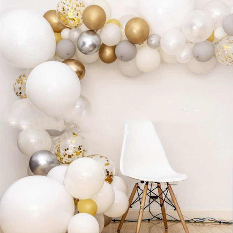 80 10-inch white balloons + 10 10-inch pearl silver balloons + 2 10-inch metallic silver balloons + 5 10-inch metal gold balloons + 5 gold sequin balloons + 5 5-inch white balloons + 5 5-inch golden balloons + 5 inch pearl silver 5 + 18 inch white balloon 4 + balloon chain + dispensing