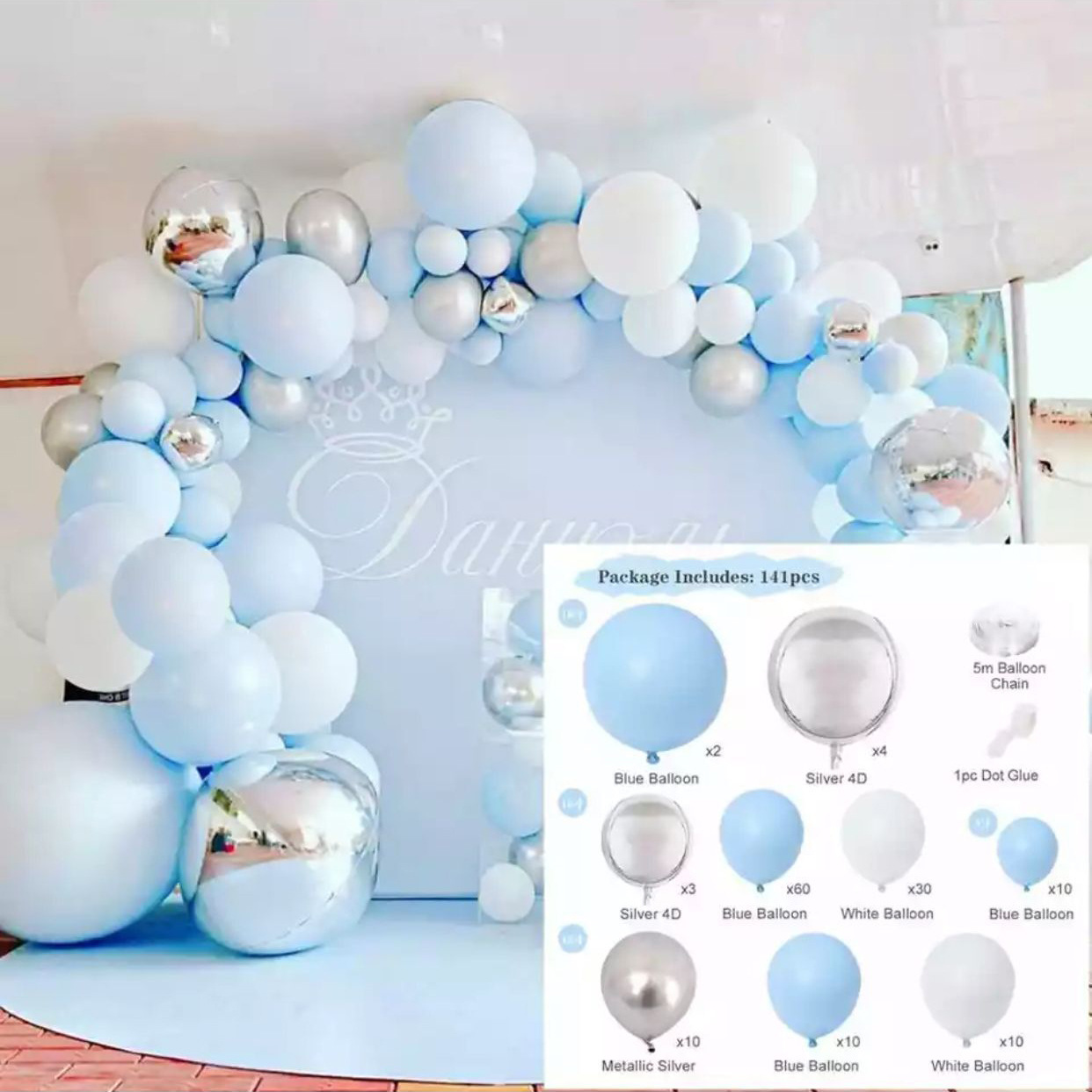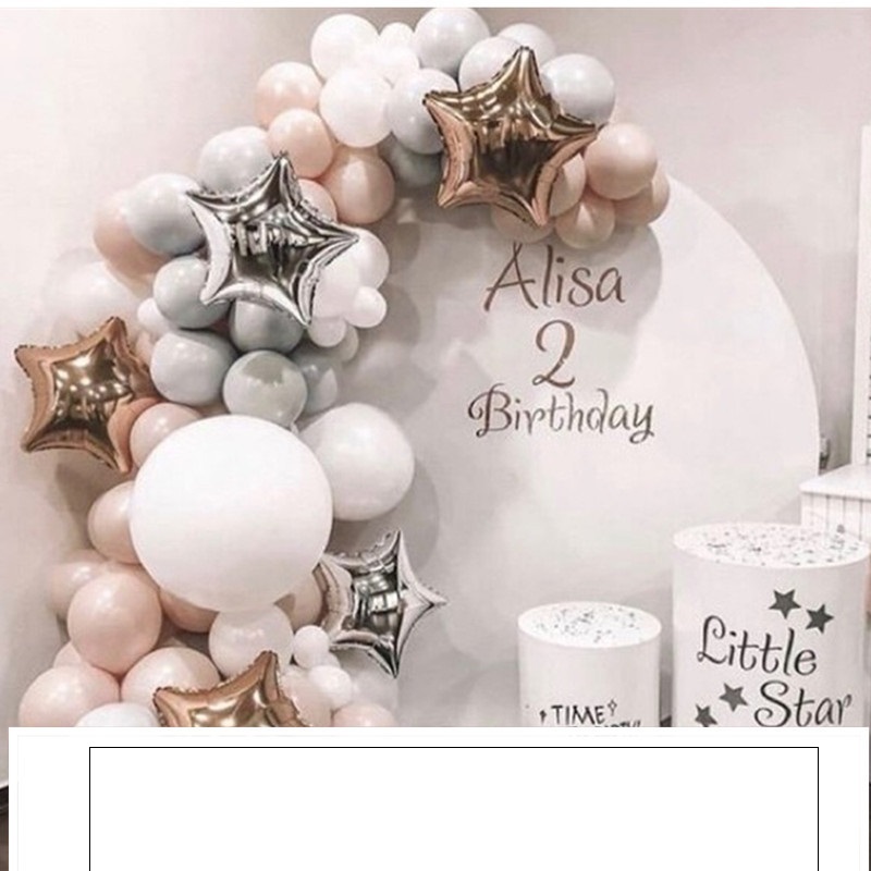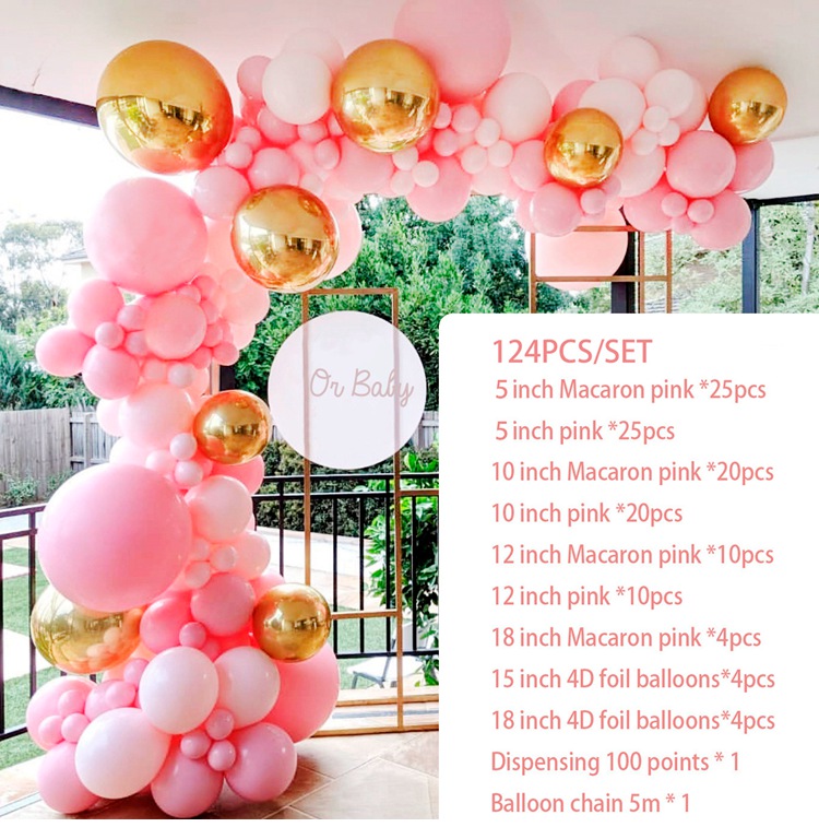 4Style: The product contains 30 5-inch macarons + 50 10-inch macarons + 60 10-inch macarons gray + 10 12-inch macarons + 10 12-inch rose gold sequins + 18-inch Macaron powder 2 pcs + 18 inch macaron gray 2 pcs + 22 inch rose gold 4D ball 3 pcs + 5m double hole balloon chain 1 roll + 1 roll of glue