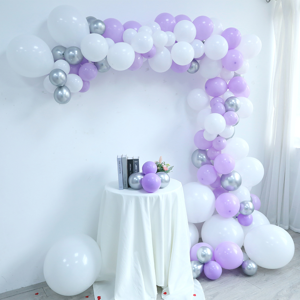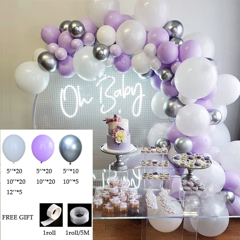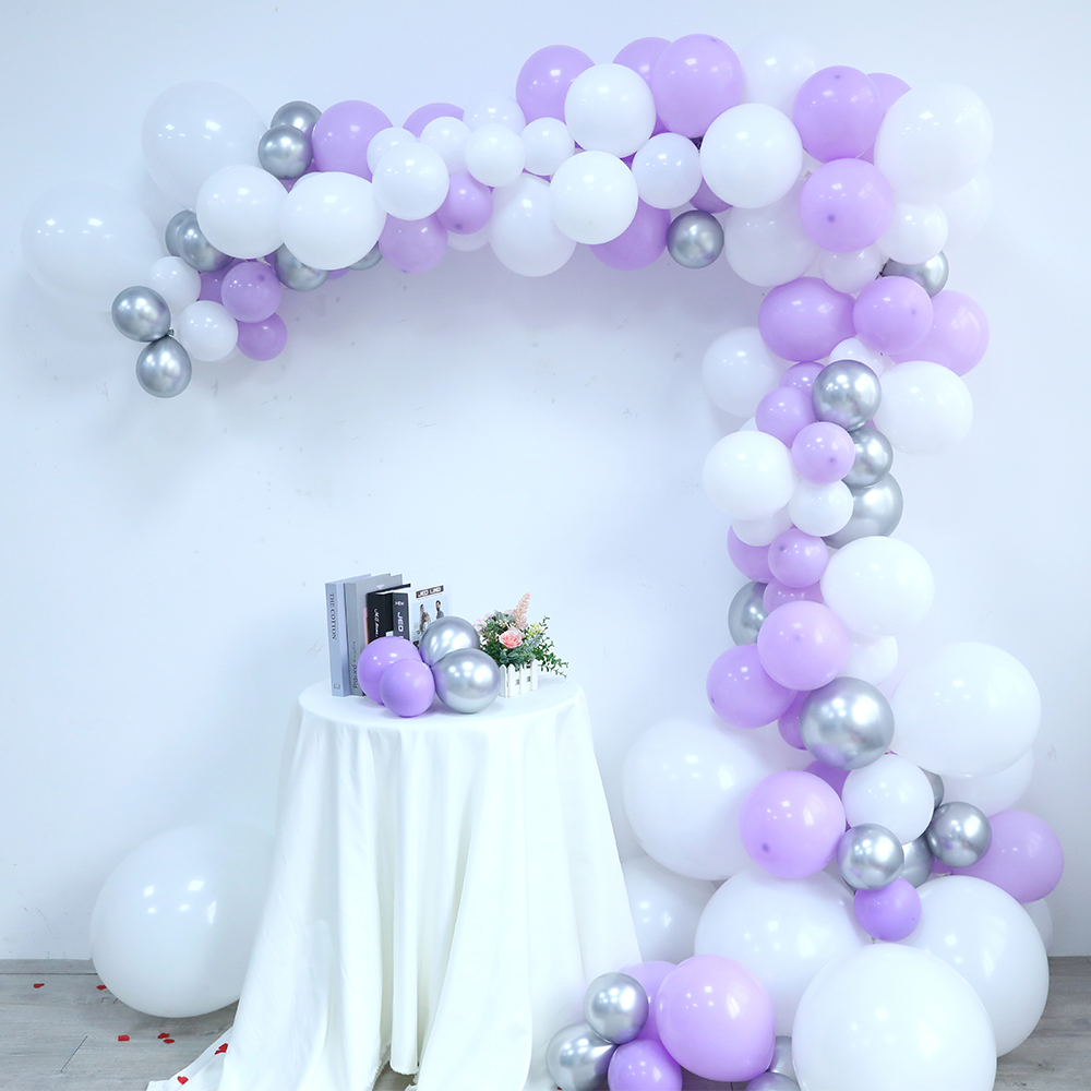 20 5-inch white, 20 maca purple, 10 metallic silver, 20 10-inch white, 20 maca purple, 5 metallic silver, 5 12-inch purple, 1 balloon chain, 1 dispensing
