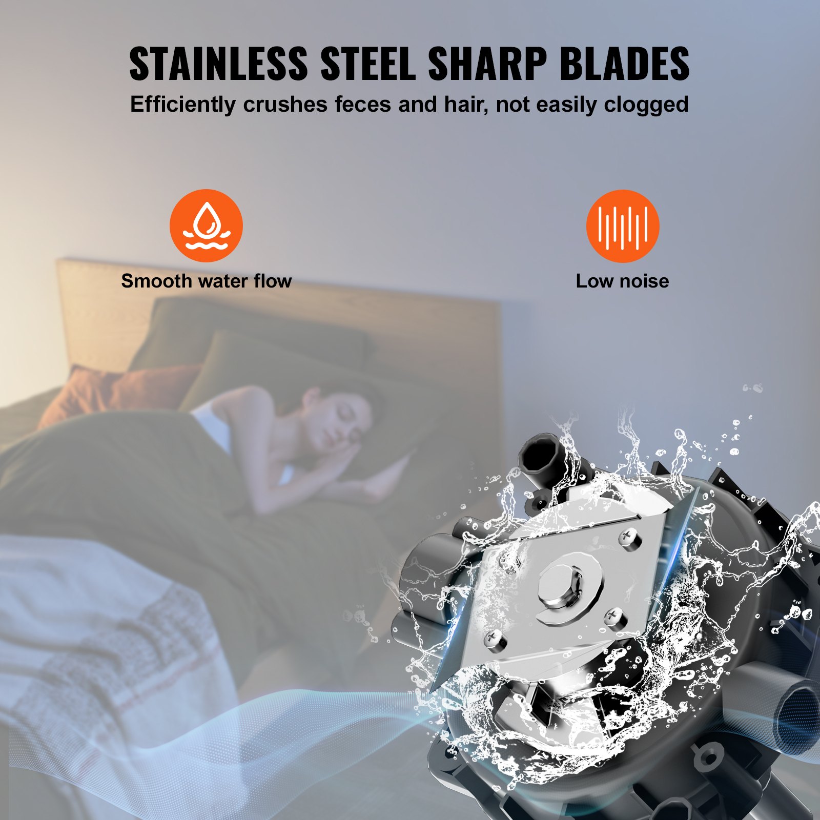 Quiet Grinding: The upflush macerating toilet system kit features an automatic start waste disposal unit. The stainless steel impeller blades grind waste such as feces and hair into fine particles, ensuring smooth water flow and transportation through small sewage pipes to the main drain. It operates at a low noise level of 40 decibels.