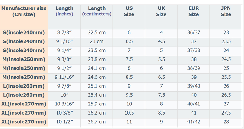 Size: XXS (suitable for foot length 18.5-19.5), XS (suitable for foot length 21.5-22.5), S (suitable for 35-37), M (suitable for 38-39), L (suitable for 40-41), XL (suitable for 42 -43), XXL (suitable for 44-45)
