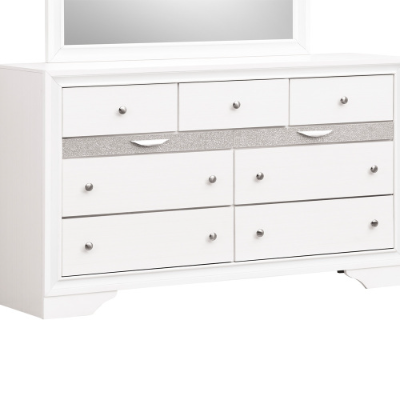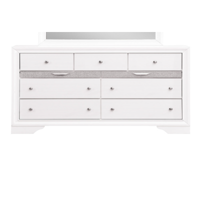 The acrylic silver trim contributes a touch of sophistication, giving the impression of crystal embellishments that further enrich the overall aesthetic. Moreover, the nickel handles are engineered to resist tarnishing, ensuring your dresser maintains a polished and contemporary appearance that will last over the years. This piece combines functionality with style, making it a perfect fit for any modern bedroom.