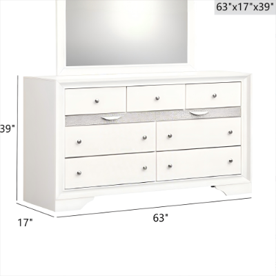 This stylish dresser features a bright white laminate wood grain finish that effortlessly complements any bedroom decor, creating a fresh and inviting atmosphere. Its dimensions, measuring 39 inches in height, 63 inches in width, and 17 inches in depth, are thoughtfully designed to provide ample storage while ensuring it does not overwhelm your space. Among the storage options, the felt-lined accessory drawer includes full extension guides for smooth operation, making it easy to access your items whenever needed. Crafted with robust wood trim, the dresser enhances stability and durability, ensuring it withstands regular use while retaining its refined look.