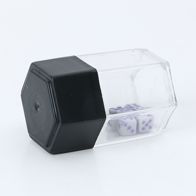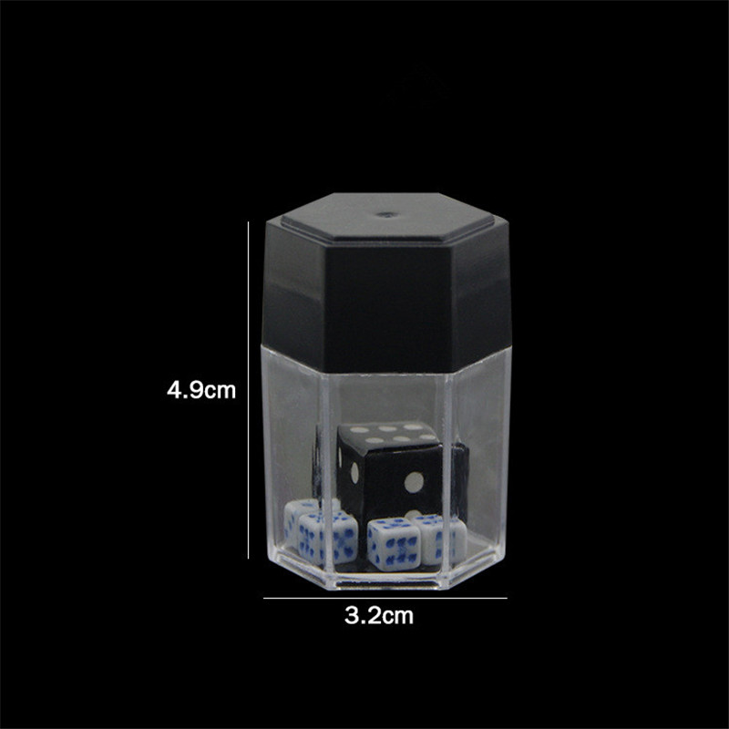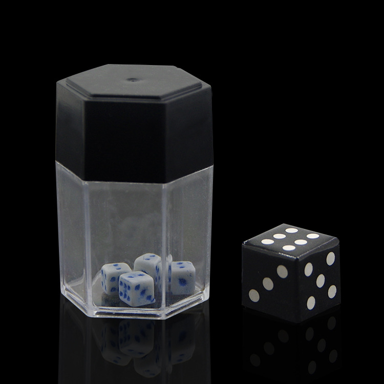 The container is opened and the small dice can be examined by audience while the large dice vanishes without a trace.