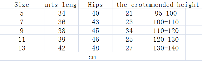 Reference height: 100cm (tag 5) 110cm (tag 7) 120cm (tag 9) 130cm (tag 11) 140cm (tag 13)