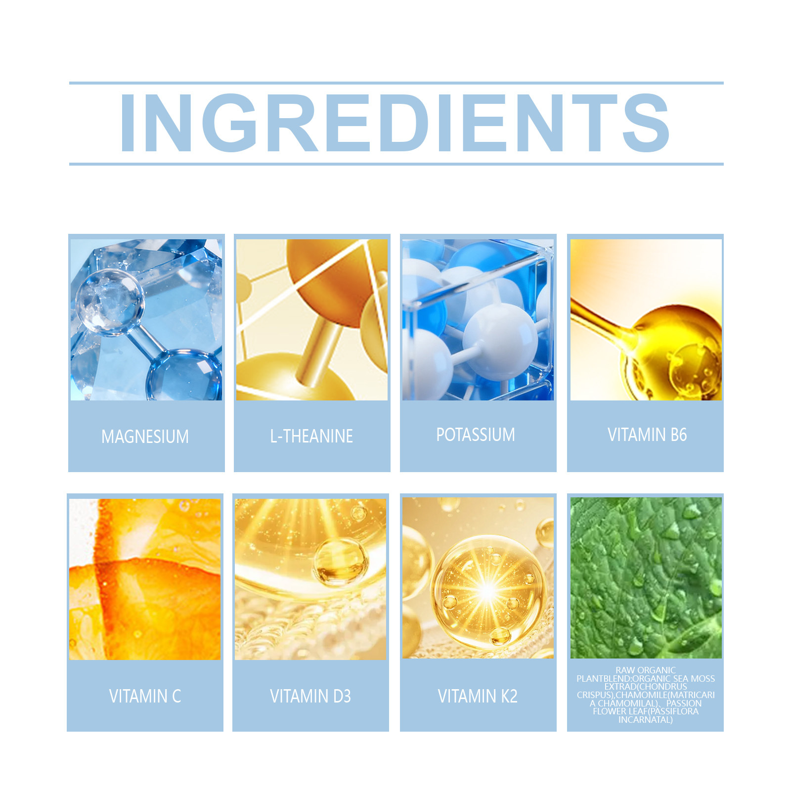 Ingredients: magnesium, L- theanine, potassium, vitamin B6, vitamin C, vitamin D3, vitamin K2, organic plant mixture: organic seaweed extract (carrageenan), chamomile (chamomile), and passion flower leaf (passion flower).