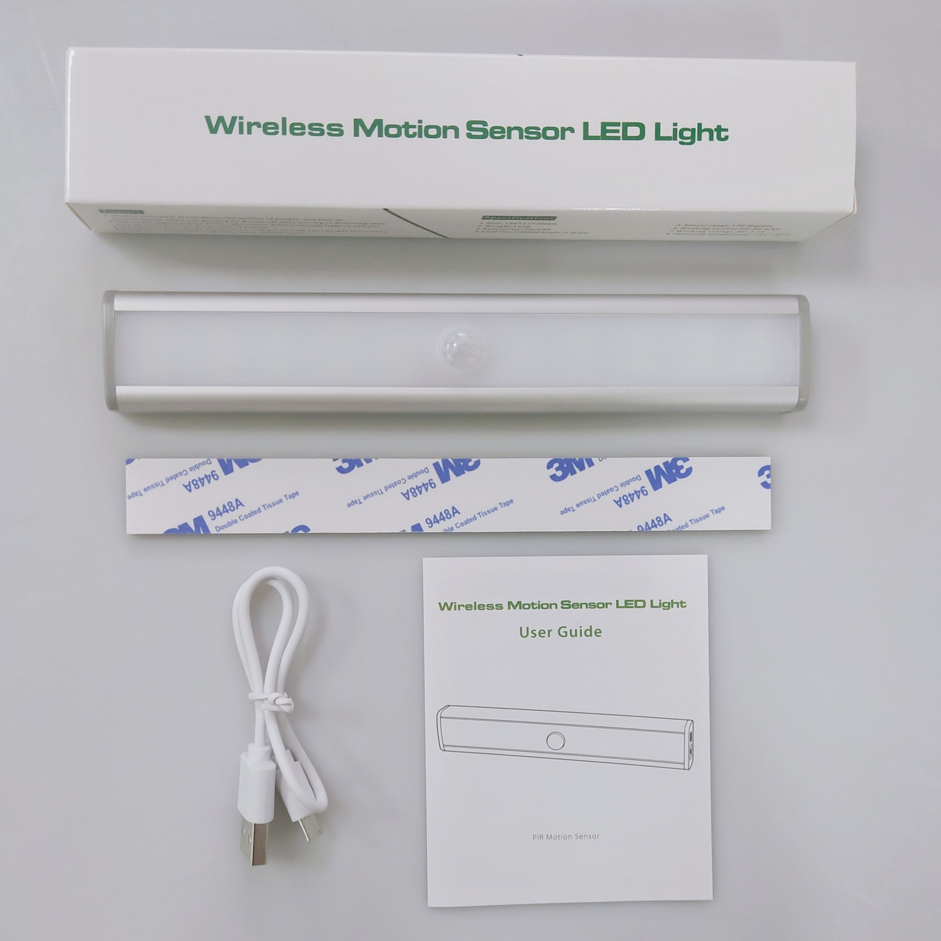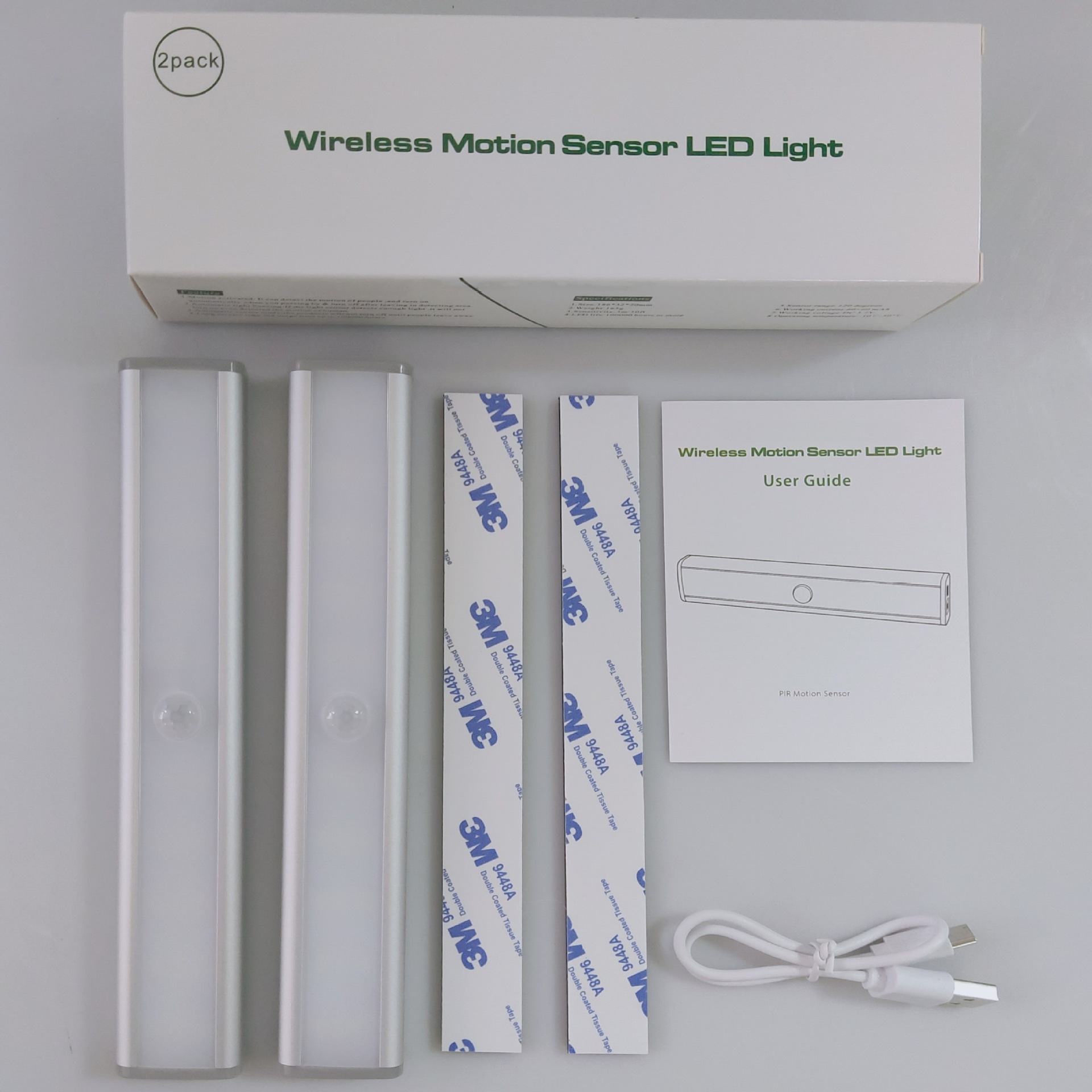 Accessories list: 2 boxes * 1, 2 lights * 2, magnetic stripe * 2, bubble bag * 2, USB charging cable * 1, English manual * 1