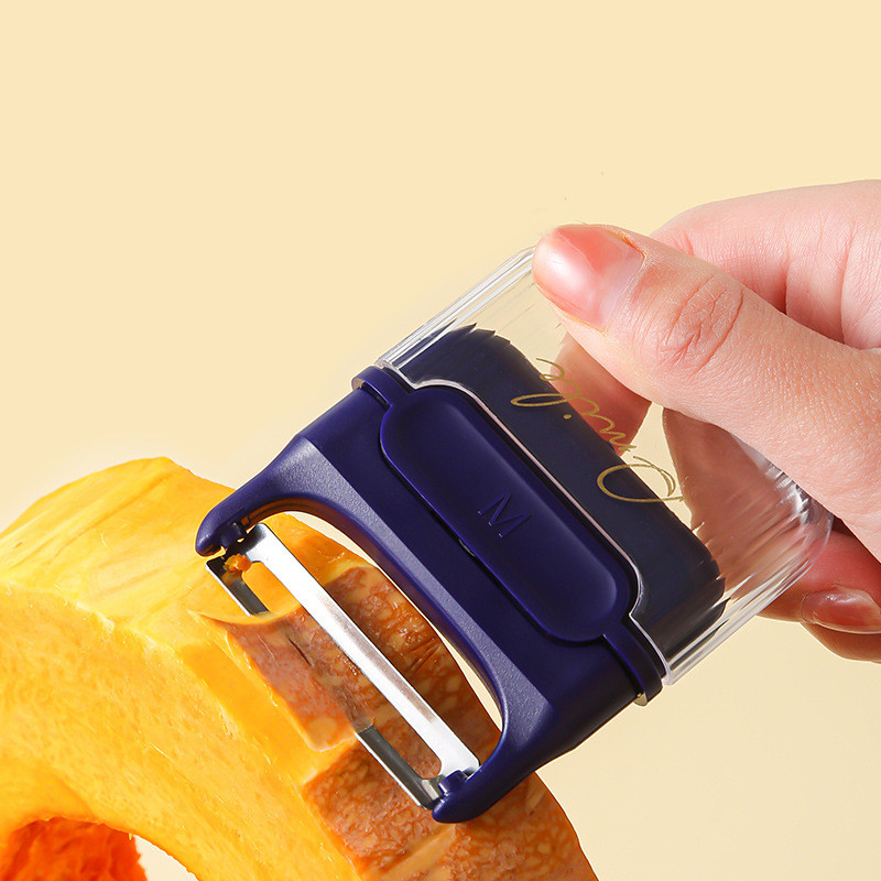 It is a peeler with a very sharp blade that fits seamlessly into the peel, peeling thinly and evenly without wasting flesh and locking in the moisture of the food.