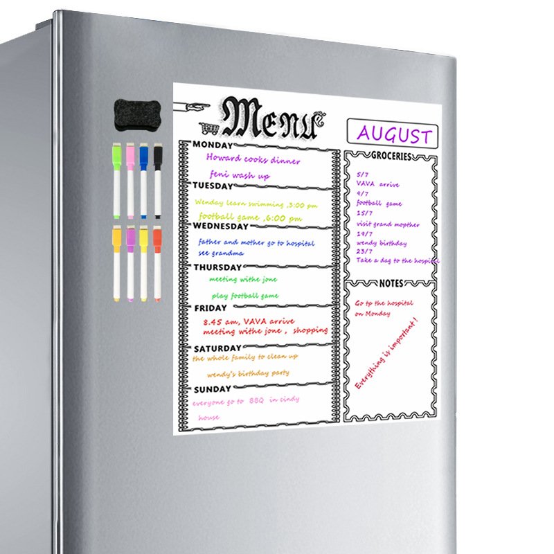Reusable panel: easy to clean. Clean with a damp or dry cloth. Write and wipe easily. Suitable for any kitchen refrigerator, office file cabinet or reusable and recyclable magnetic socket area. Make sure to use it for a long time without curling, and it can be rolled up and stored easily when not in use.