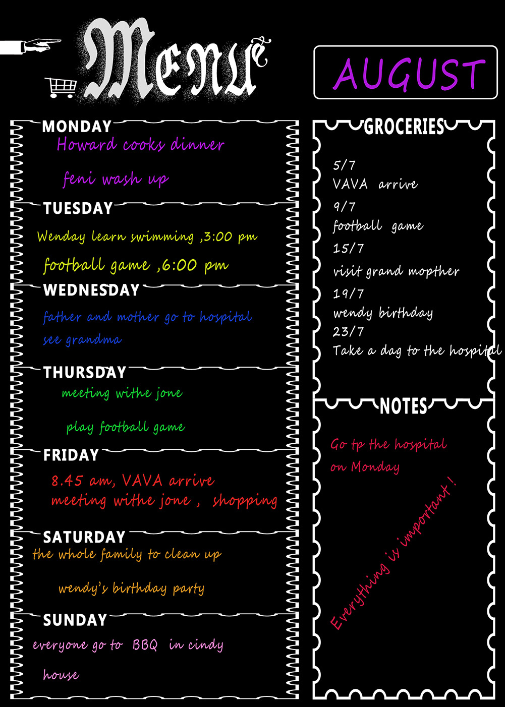 Have a nice day: list tasks, notes, menus, meal planner, shopping list, dates, important numbers. Arrange your schedule through the weekly board meeting to make your busy life easier and have a happy life.