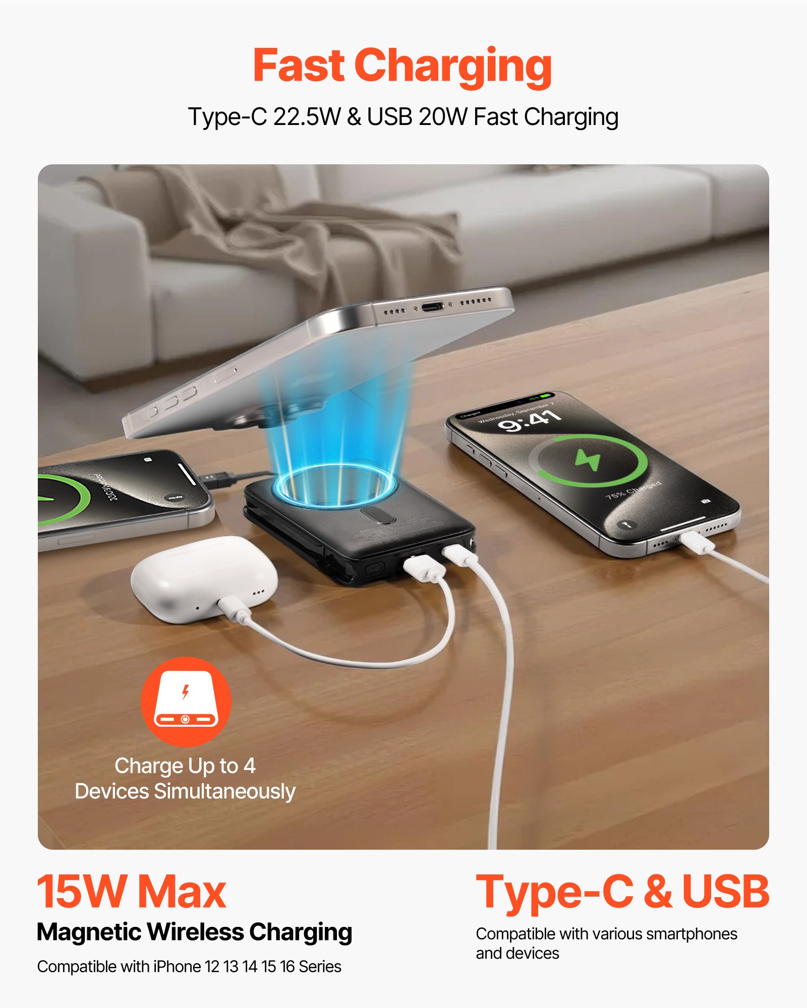 Magnetic Charging Made Easy: No need for cables – simply place your device close to the magnetic wireless power bank and start charging! With 20W USB and 22.5W Type-C fast charging, this power bank supports charging for up to 4 devices simultaneously