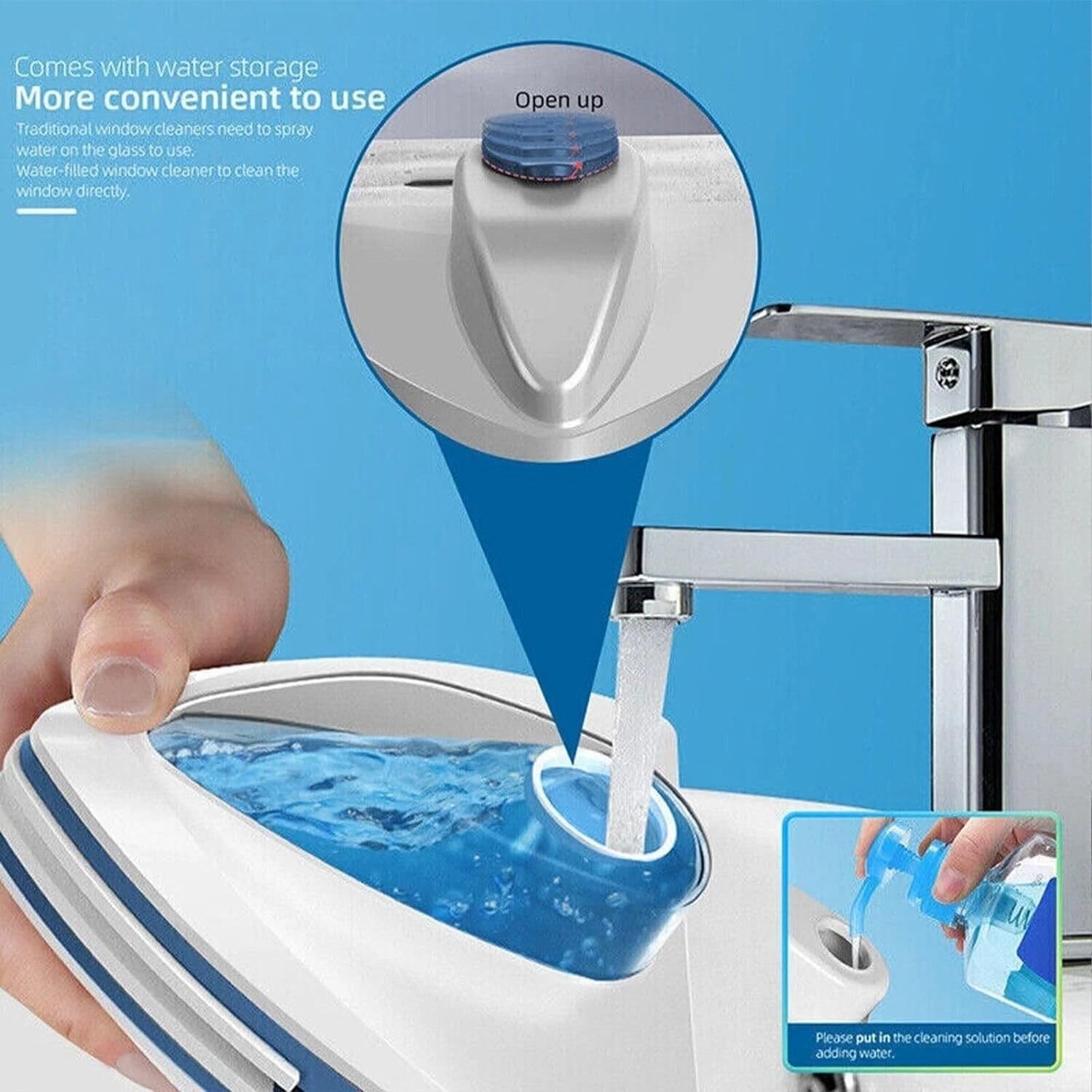 1. Tilt the window cleaner into the cleaning solution before filling with water for a cleaner window.
