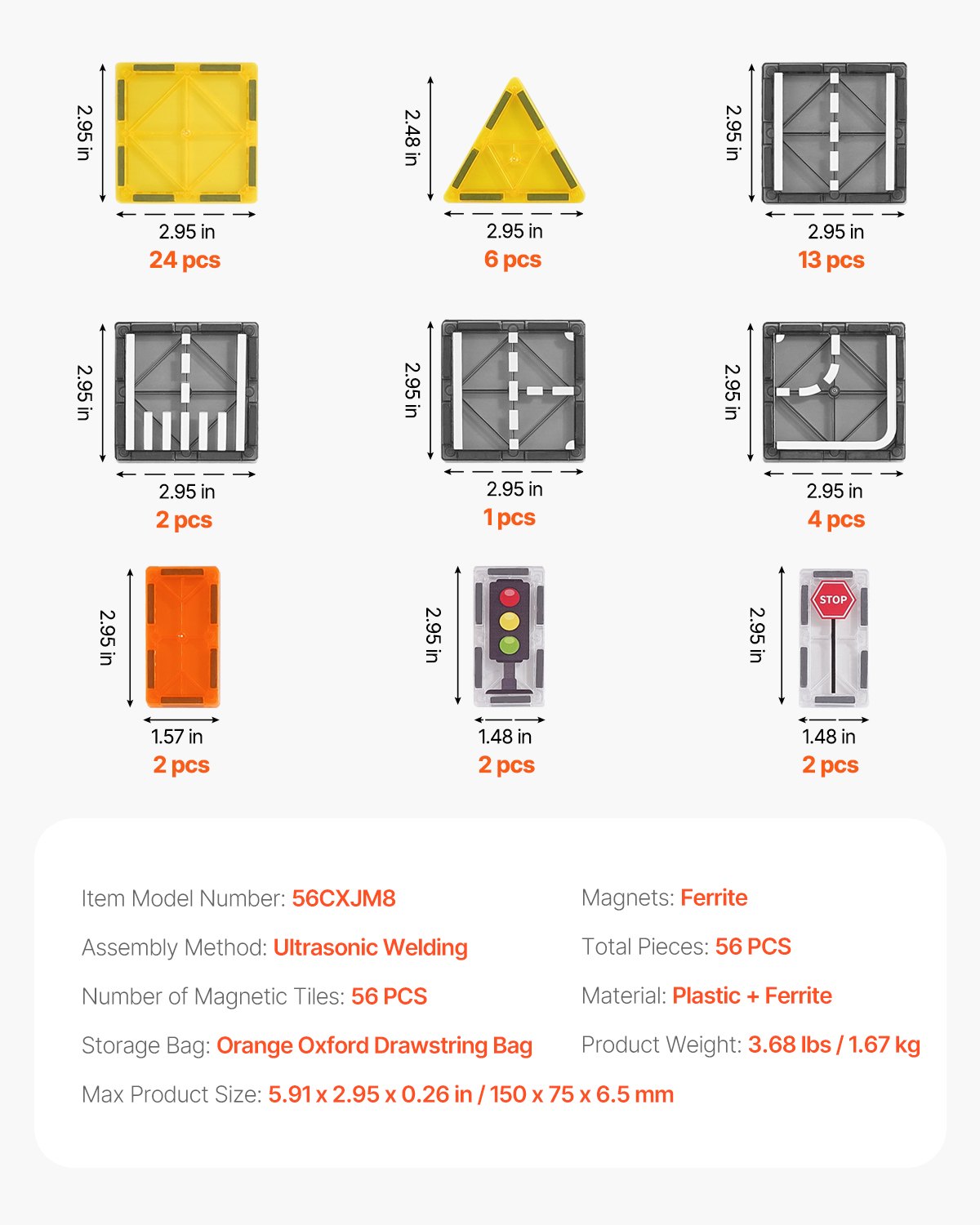 Anzahl der Magnetfliesen: 56 Stück,Maximale Produktgrö_e: 5,91 x 2,95 x 0,26 Zoll / 150 x 75 x 6,5 mm,Produktgewicht: 3,68 lbs / 1,67 kg,Material: Kunststoff + Ferrit,Artikelmodellnummer: 56CXJM8,Aufbewahrungstasche: Orangefarbener Oxford-Beutel mit Kordelzug,Montagemethode: Ultraschallschwei_en,Magnete: Ferrit,Stückzahl insgesamt: 56 Stück