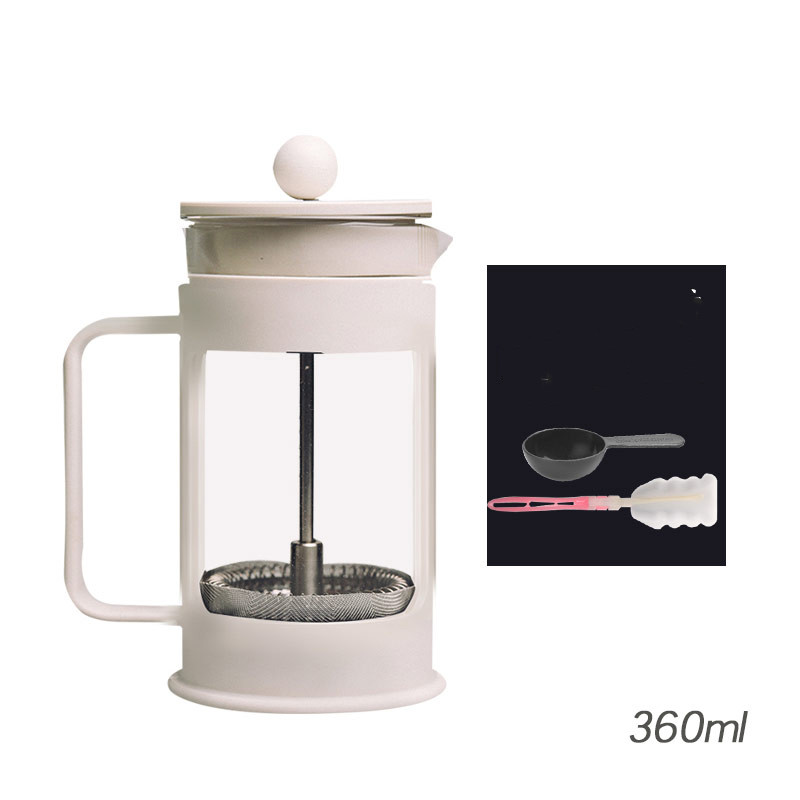 Popular elements: solid color Classification: Glass pressing pot black (small) 360ml glass pressing pot white (small) 360ml glass pressing pot black (large) 900ml white 900ml glass pressing pot black 360ml+ [+9.9 yuan for a double glass coffee cup]