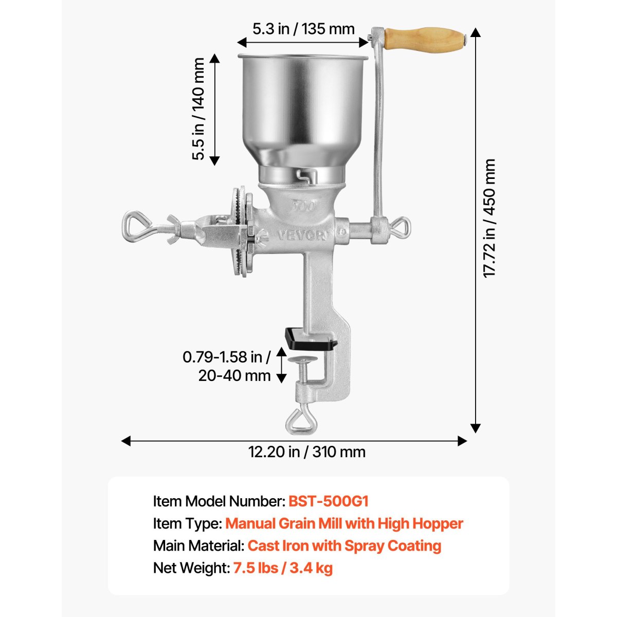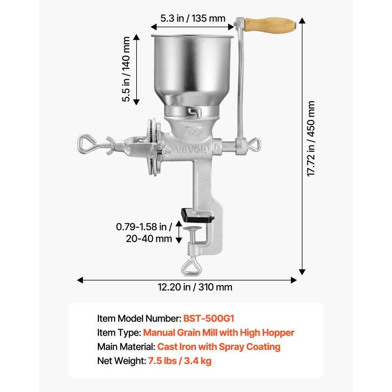 Stable Table Clamp Design: This corn grain grinder clamps securely to tables with a 0.79–1.58 in (20–40 mm) opening range, reducing shifting for steady grinding