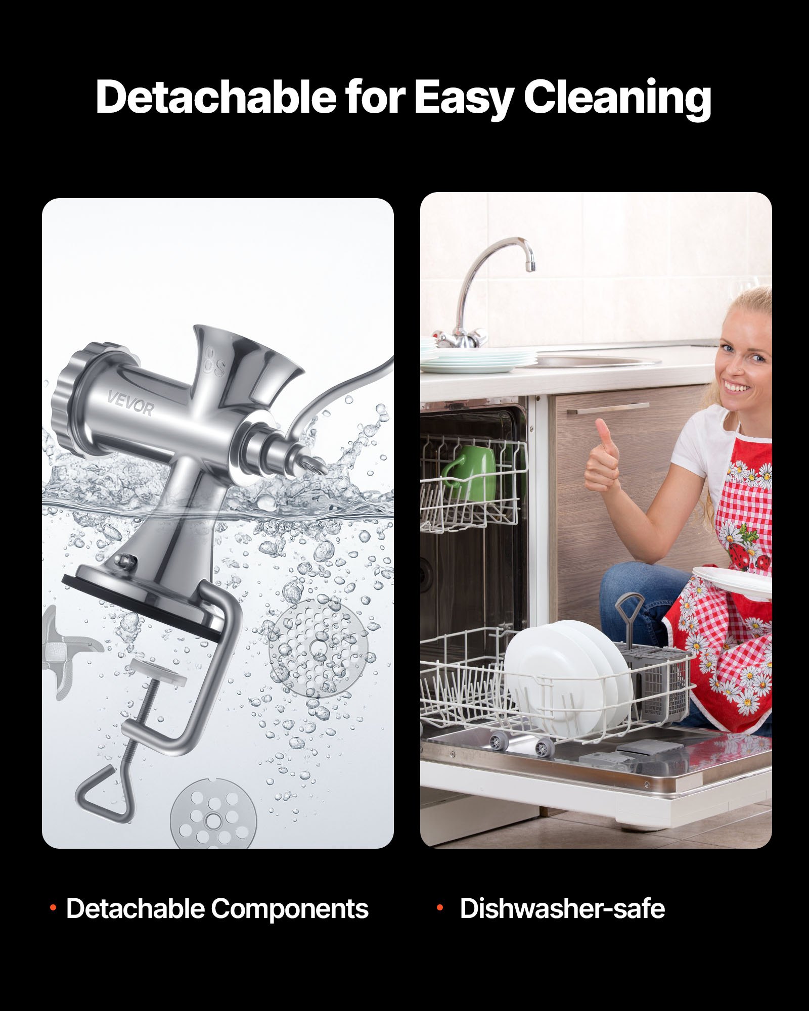One Meat Grinder, Endless Uses: VEVOR multifunctional manual meat grinder allows for easy vegetables and meat grinding to make meatballs, cookies, sausages, and more. It also comes with 5mm and 8mm cutting plates, 1 cutting cross blade, 1 stainless steel sausage tube, 1 cookie attachment, 1 grinding head and meat pusher rod, catering to the diverse needs of different culinary creations.
