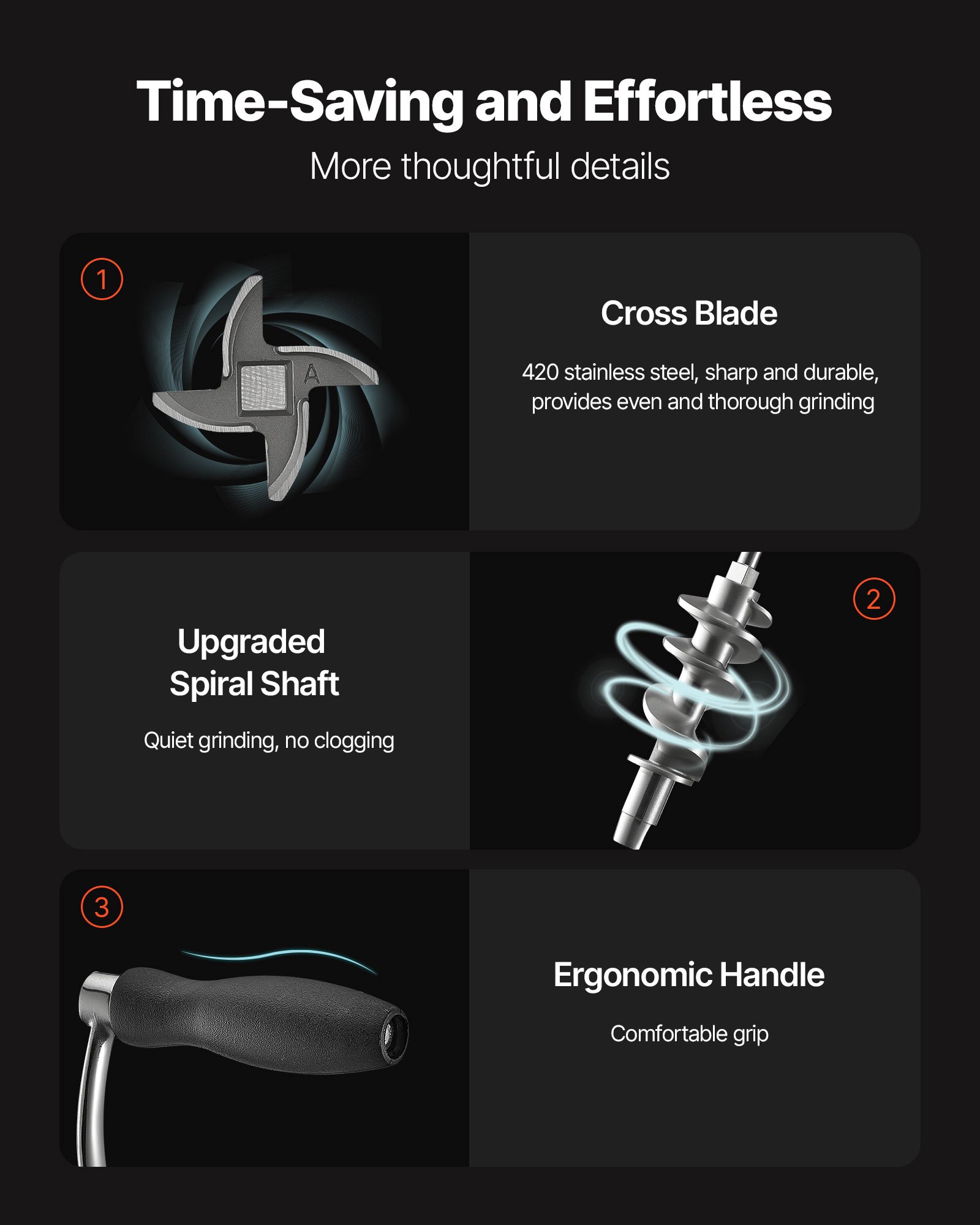 Stable Hand Operation: Equipped with a steel table clamp and non-slip pads, this hand-operated meat grinder stays firmly in place during use, preventing any slipping. The clip opening range (0.4"-1.8"/10-45mm) ensures a stable operation