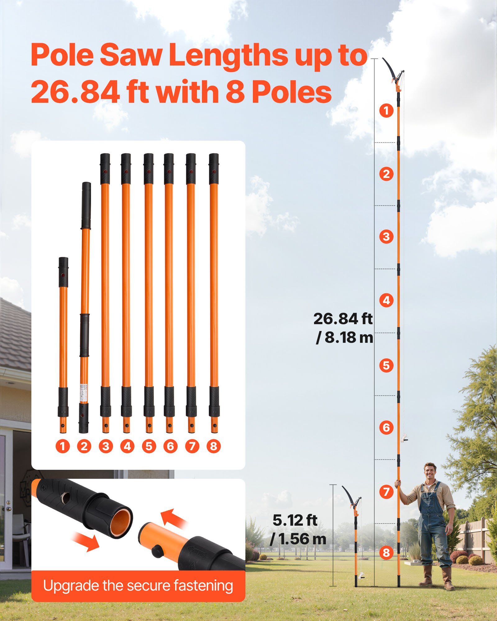 Easily Trim High Branches: Equipped with 8 adjustable sections, this manual pole saw extends up to 26.4 ft, allowing ladder-free trimming of high branches. It is ideal for pruning dead or low-hanging branches, maintaining your yard or garden